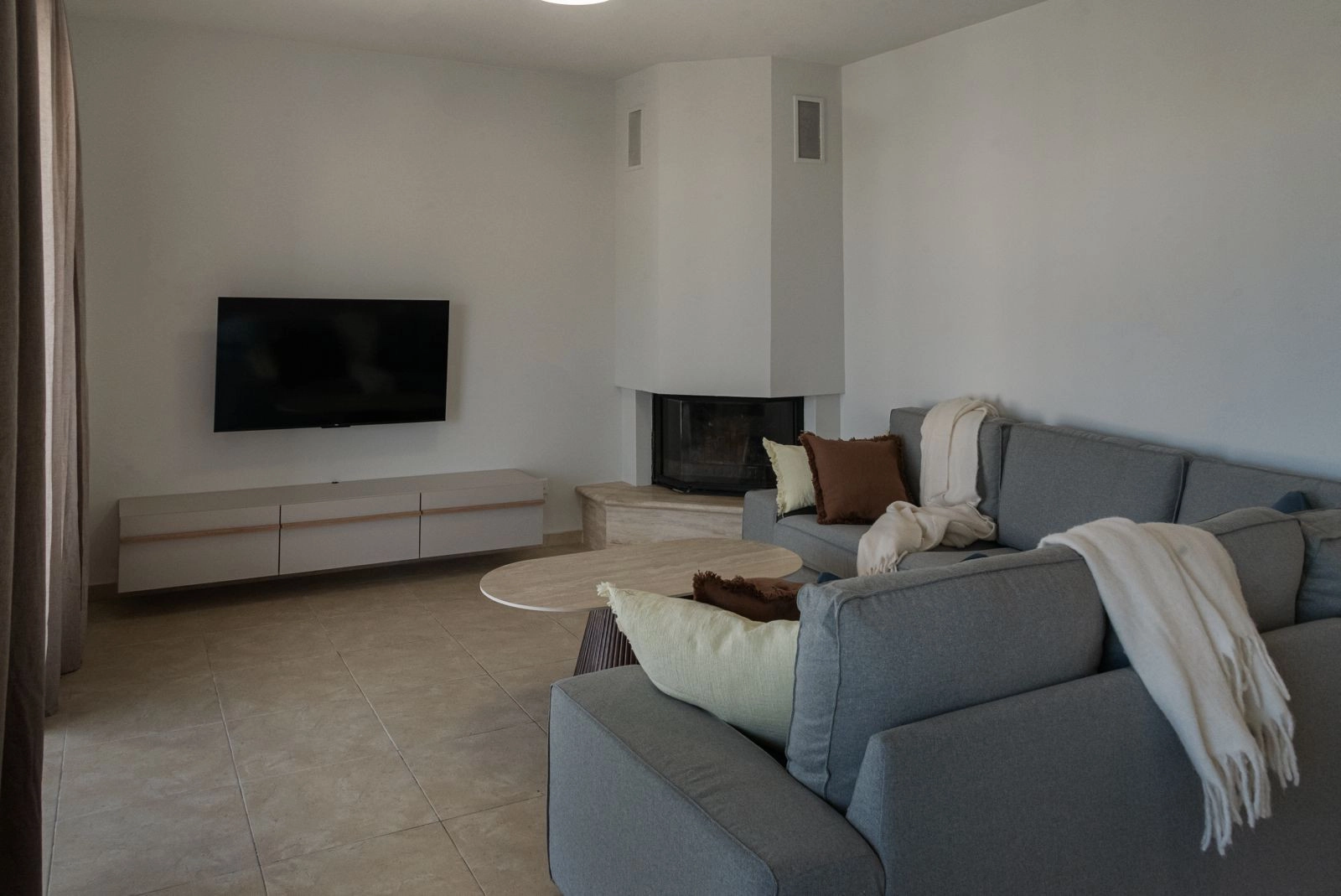 Bright and airy living room with indoor fireplace