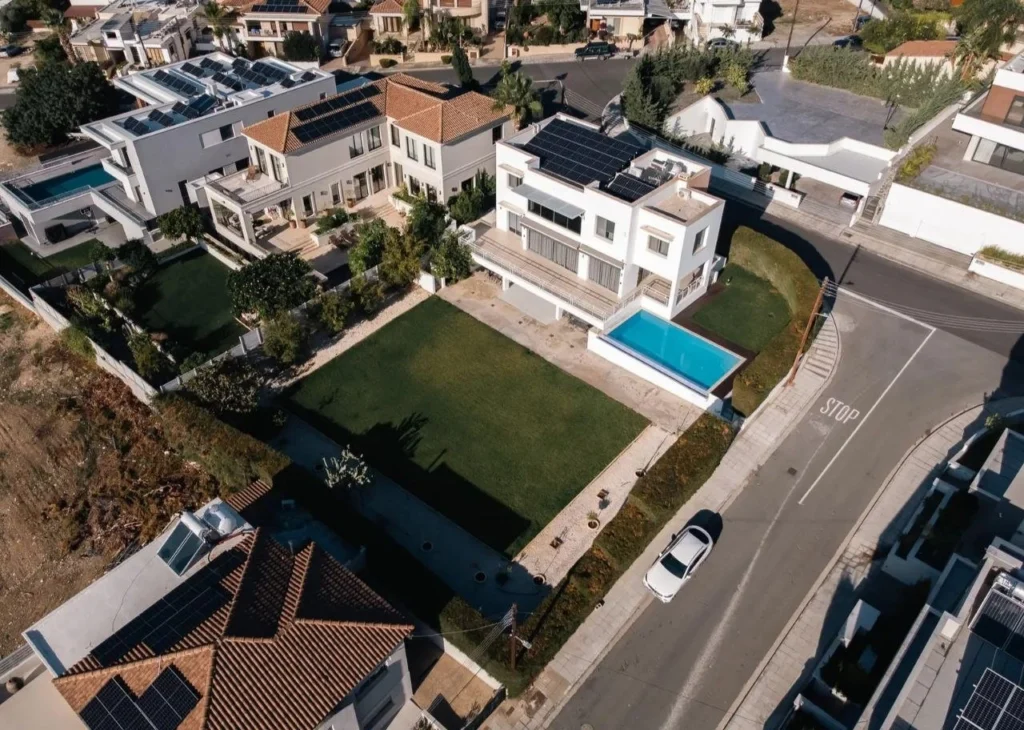 Set on a 1,200 m² private plot, the residence offers 465 m² of internal living space across three levels, with unobstructed panoramic views over Limassol Bay.