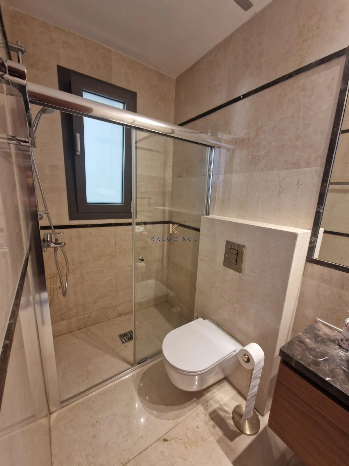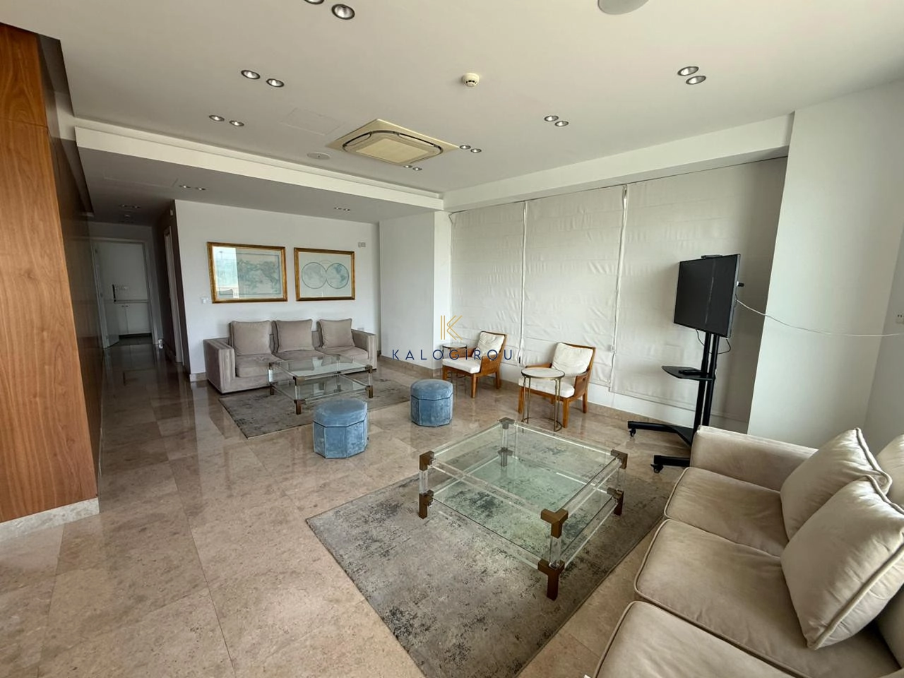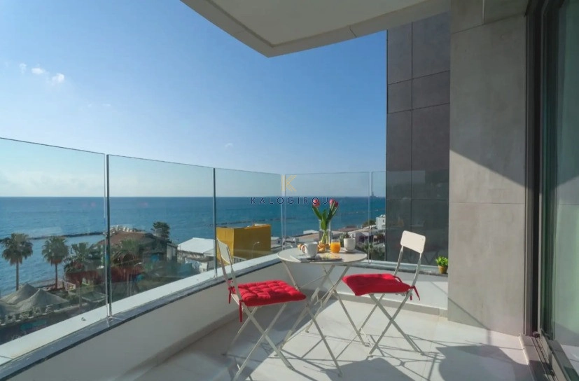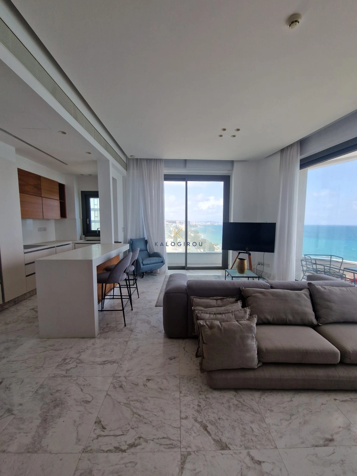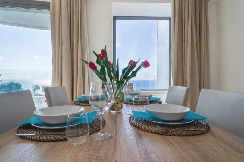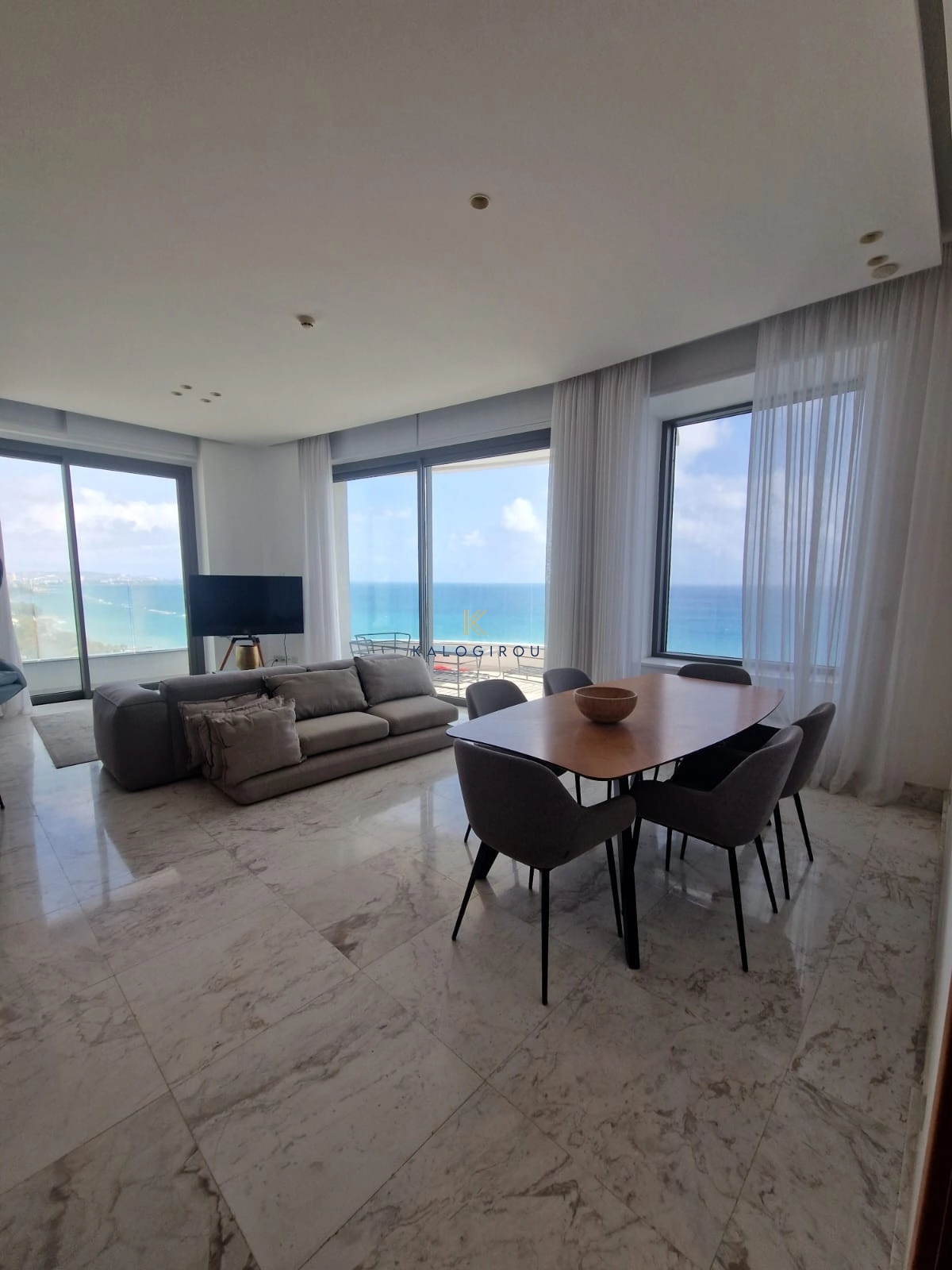 The apartment is beautifully designed in minimal and earthy tones with a refined coastal touch, offering a spacious and functional layout. It features a modern open-plan kitchen with island, seamlessly connected to the living and dining area, all enjoying uninterrupted views of the Mediterranean Sea. The property comprises two elegant bedrooms with wooden parquet flooring and two bathrooms in total, including a master bedroom with en-suite facilities. Combining comfort with a sense of refined luxury, the apartment offers 99 sq.m. of internal covered area, an 18 sq.m. covered balcony, and is fully furnished to a high standard.