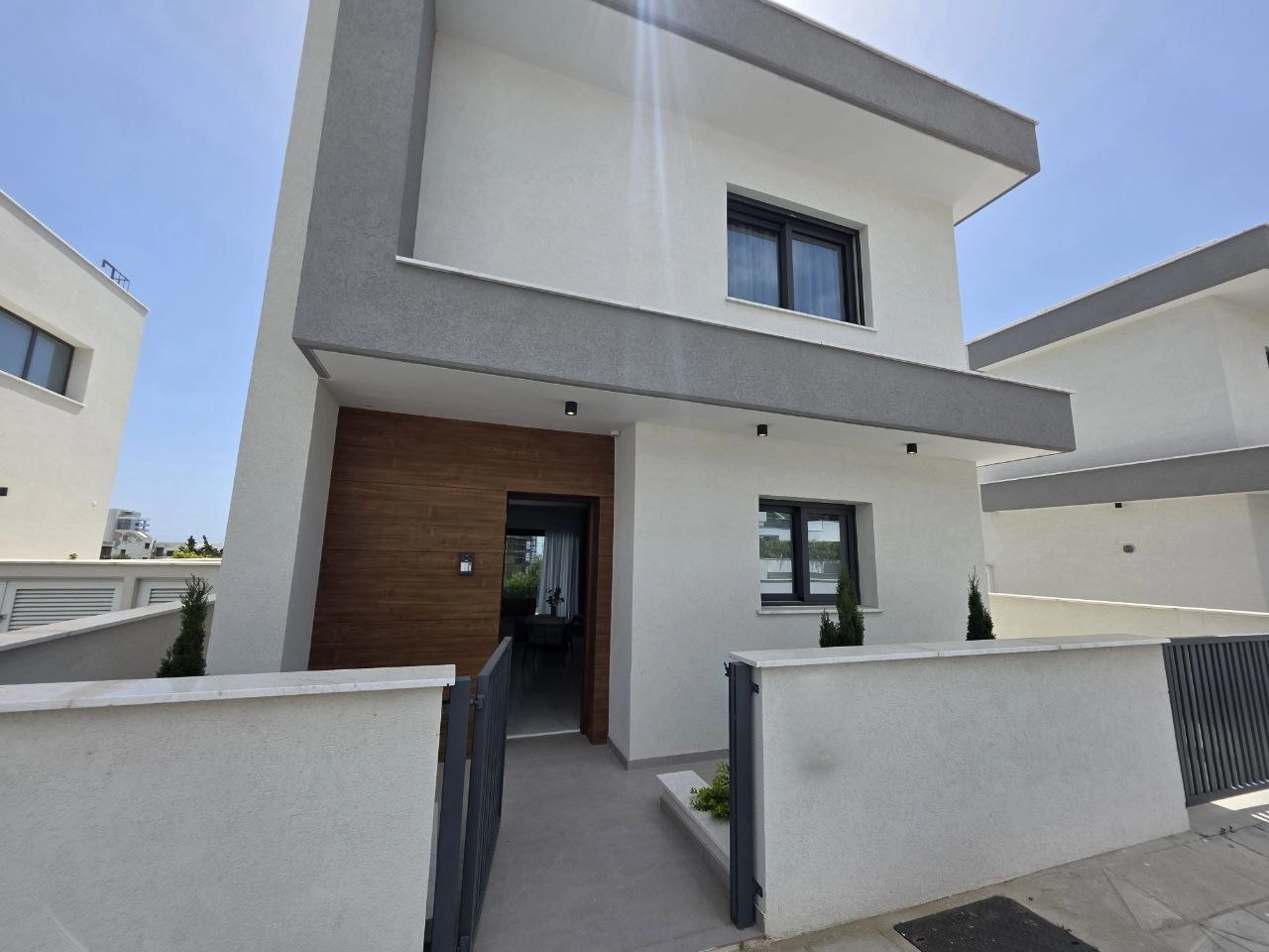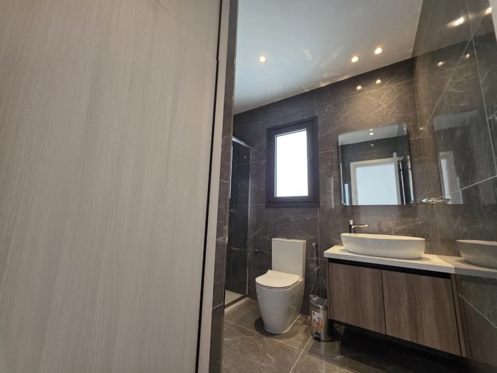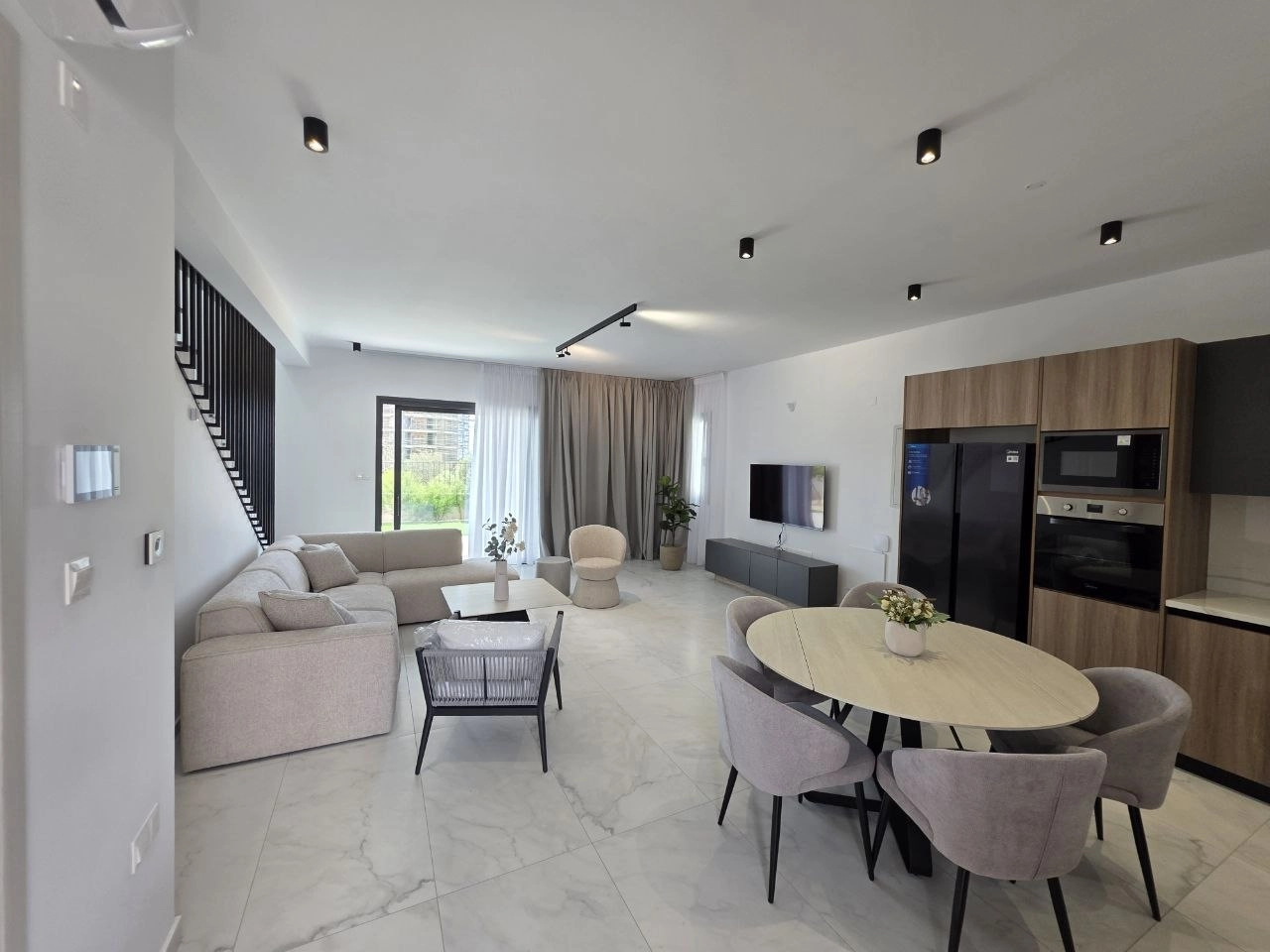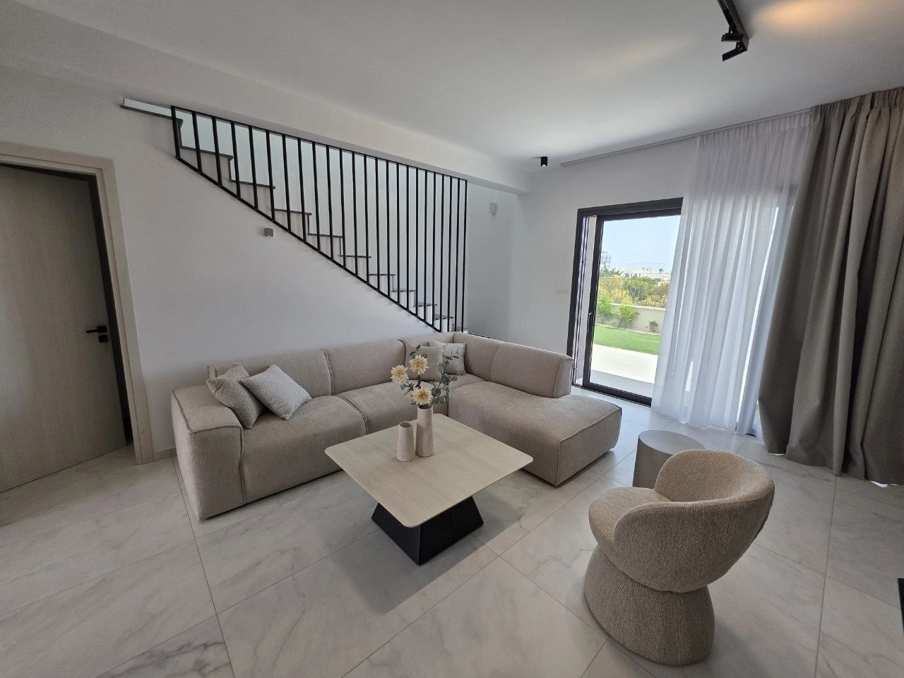 A new 2 bedroom furnished house for rent in the area of Agios Thychonas. The house is located in a complex with a private road. On the ground floor there is a spacious living room with an open-plan kitchen, a guest bathroom and a storage room under the stairs. On the upper floor there are 2 bedrooms, each with its own bathroom. The living area is 120m2, the covered veranda is 43m2. Each room has electric shutters and underfloor heating. There is a dishwasher. The washing machine is in the bathroom. There is an alarm system. Pets are by agreement.