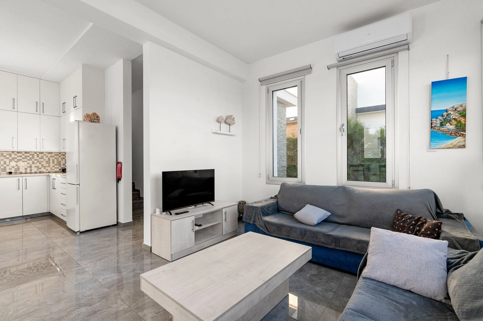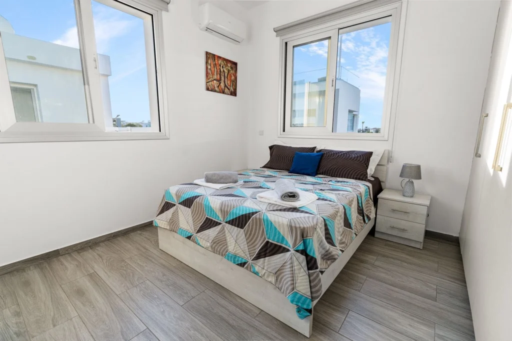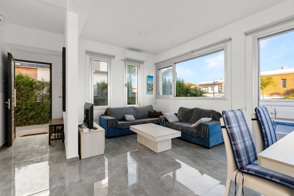 3 bedroom house for rent in Kapparis. The villa includes three bedrooms, two bathrooms and a guest toilet, a kitchen and a spacious living room. The house is fully furnished and equipped with household appliances and air conditioners. There is a private swimming pool and parking on site. The villa is located in a peaceful and quiet complex. shops, cafes and restaurants are within walking distance. The beach is a couple of minutes away.