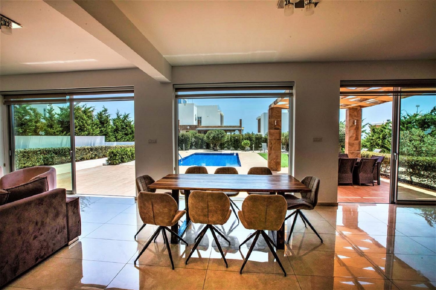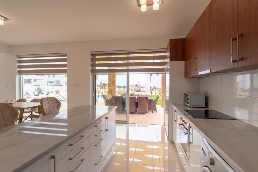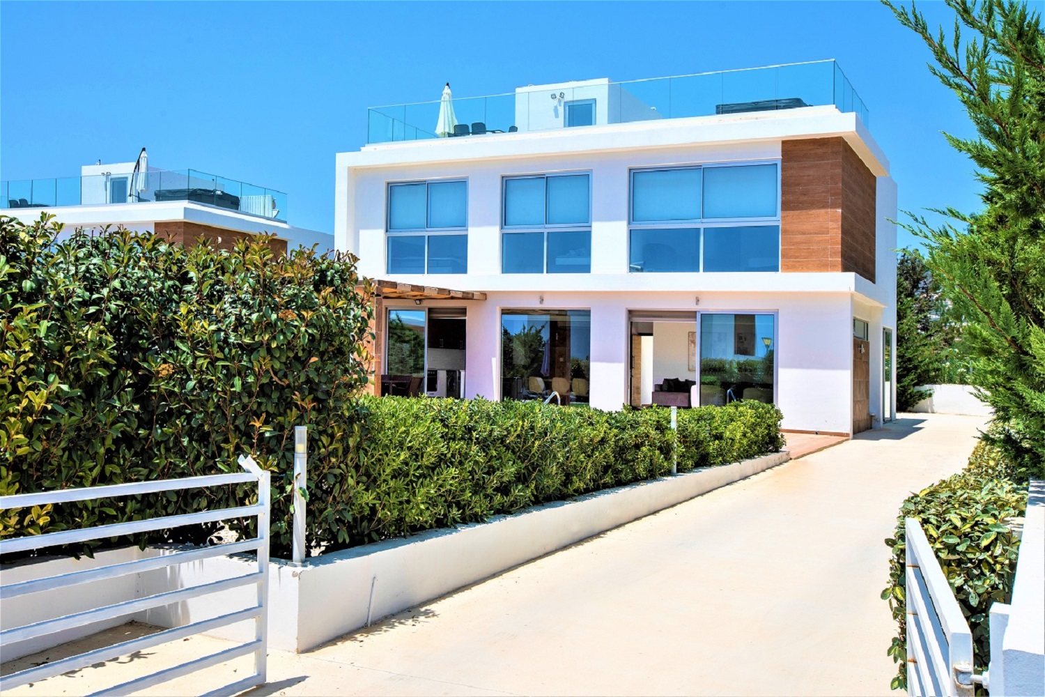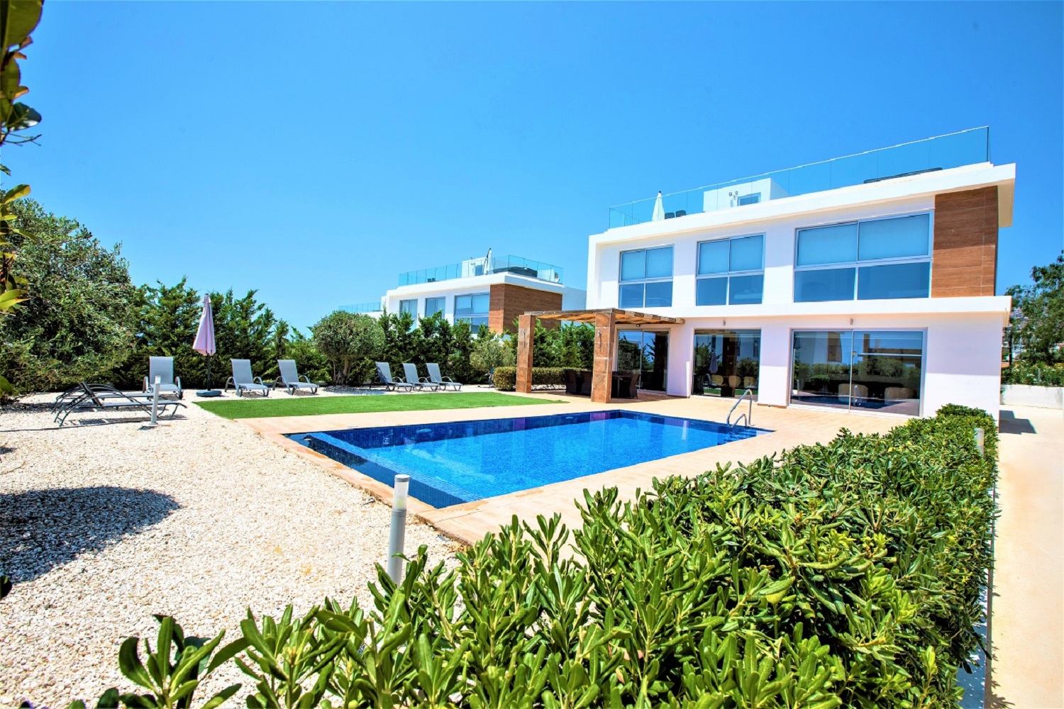 Beautiful 4-bedroom en-suite villa featuring a private pool, garden, and hot tub. Fully furnished and equipped, including a modern kitchen with dishwasher, oven, microwave, and stove. The property offers a roof terrace with sea views, air conditioning in all rooms, private entrance, and private parking, all within a secure complex. Ideally located just 2 km from Coral Bay, close to beaches and amenities. Available from November 1st. Rental price includes pool and garden maintenance.