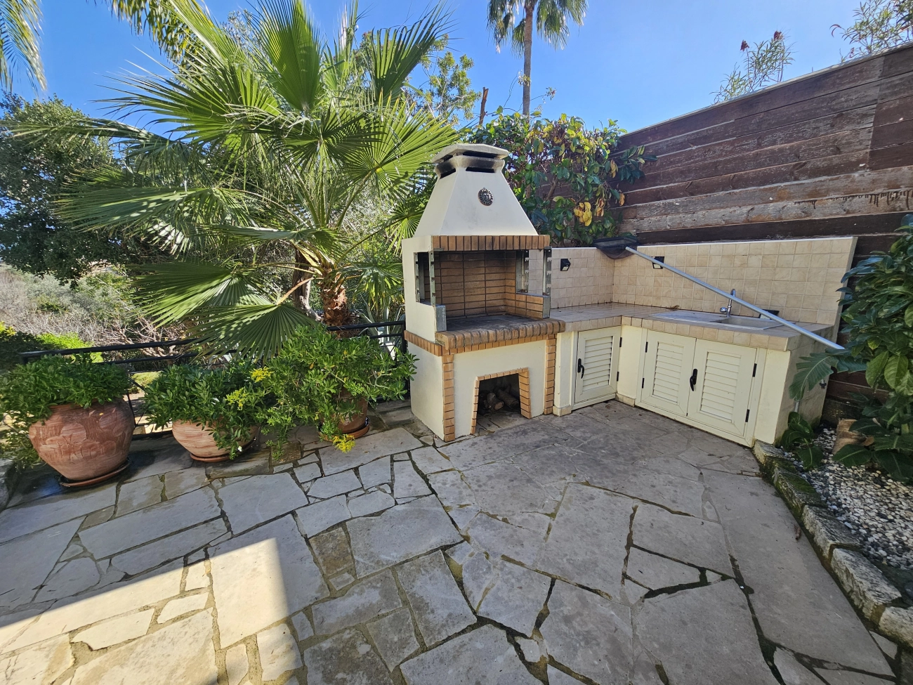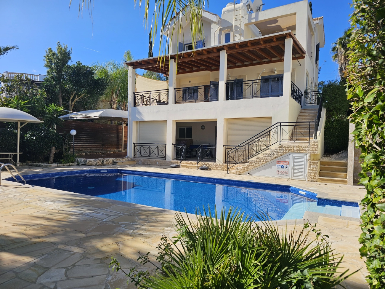 Four-bedroom villa for rent in Neo Chorio Pafou, Paphos with a total area of 240 m2, located on a plot of 800 m2 and just 150 meters on foot from the sea, the villa consists of three floors and offers four bedrooms, three bathrooms and a guest toilet, two living areas and a fully equipped kitchen with appliances and a coffee machine, the villa is fully furnished It is equipped with air conditioning in all rooms, there is Wi-Fi, two TVs, a private swimming pool, a well-kept garden, balconies, a game room, a BBQ area, a tennis table and a covered parking lot, built in 2006.