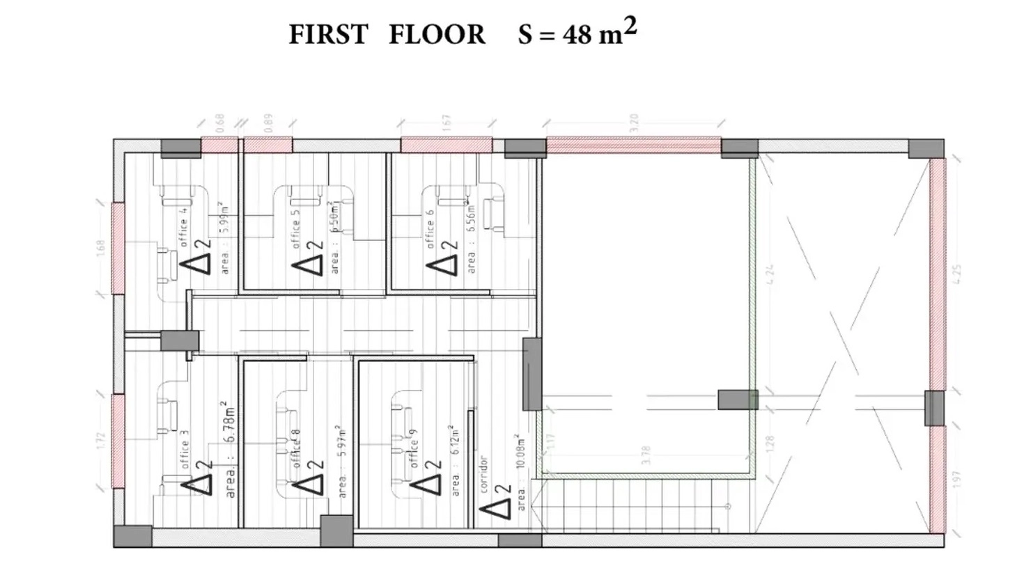 A new 128 m2 office for rent in the area of Mesa Geitonia, Limassol. The office is located in the very center of the city. The premises include: on the ground floor (49 m2) there is a reception area, two separate offices, a kitchen corner, a server room and a bathroom; on the ground floor (48 m2) there are six office rooms, two of which have no windows. The office is partially furnished, with four workstations and a reception desk. All engineering systems and communications are new and fully operational. If necessary, additional air conditioners can be installed in consultation with the landlord. There are two private parking spaces on site, as well as free public parking 200 meters from the building. The building was built in 2023 and has an energy class A.