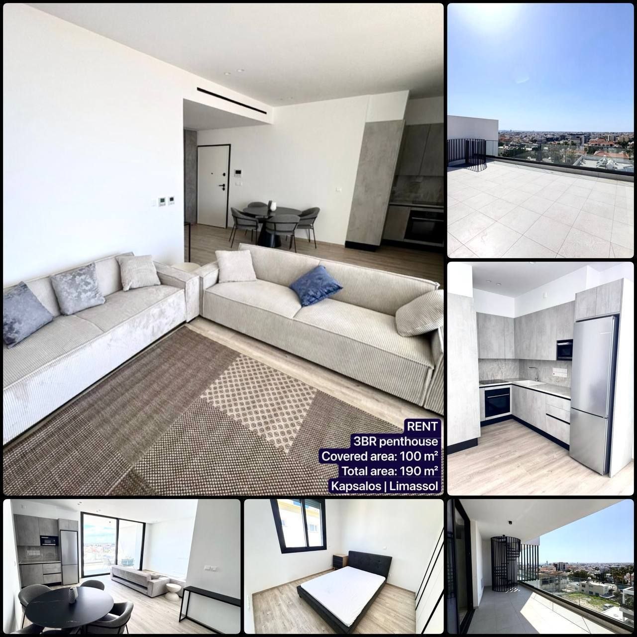 rent new 3 bedroom penthouse with terrace in Kapsalos area, Limassol. All infrastructure within walking distance, not far from Alfamega supermarket. 3rd floor living area: 100 m² total area: 190 m² kitchen living room 3 bedrooms bathrooms: 2 veranda: 26 m² terrace: 64 m² VRV air conditioning underfloor heating storage room: 4 m² parking year of construction: 2026 energy efficiency class A photovoltaics electricity bills will be inexpensive price: 3,300 + 2 deposits agency CULPRO ESTATES Ltd L.N 197/E R.N 1189 +357 95109900 +357 95592209 A286