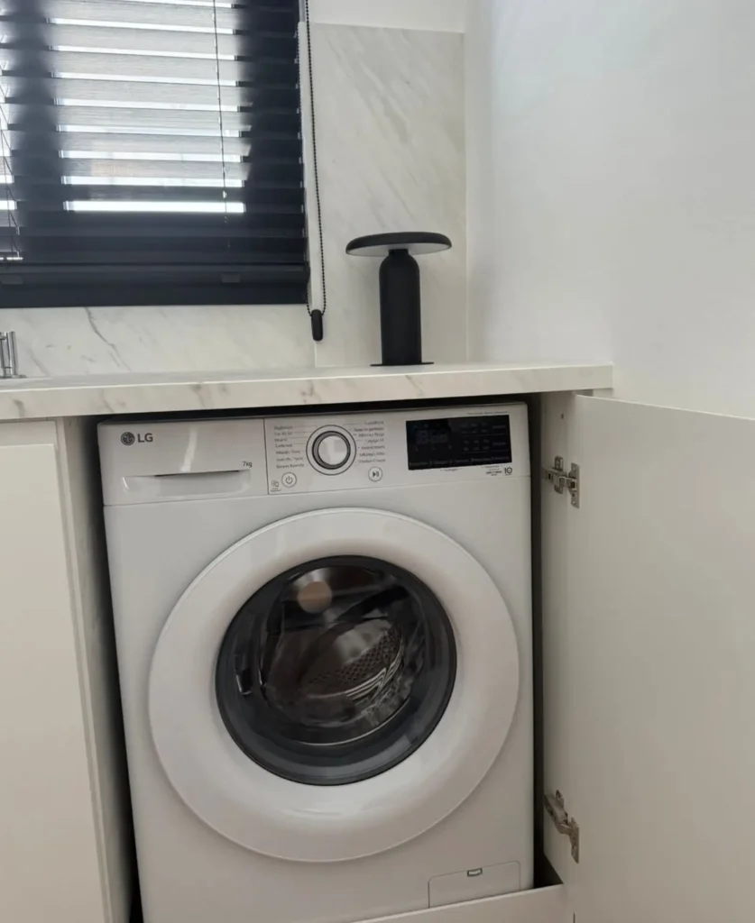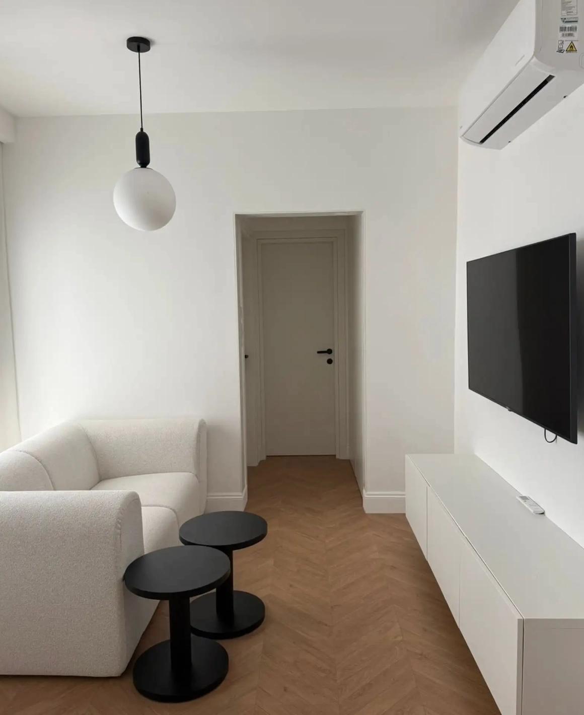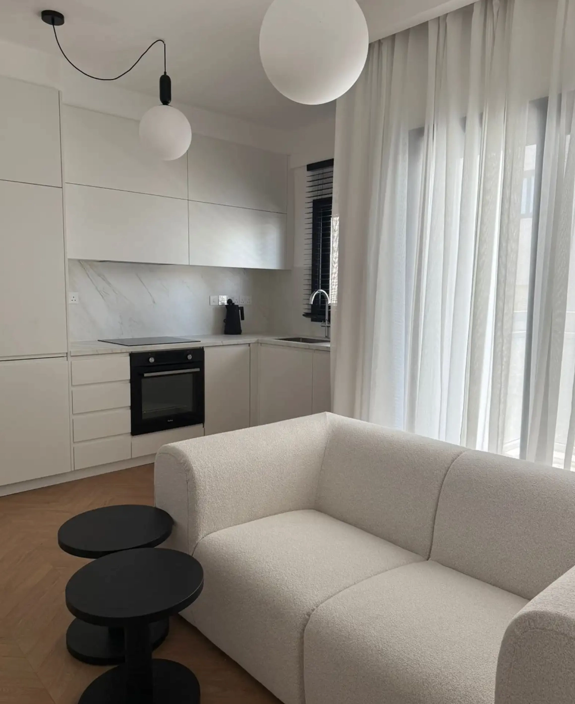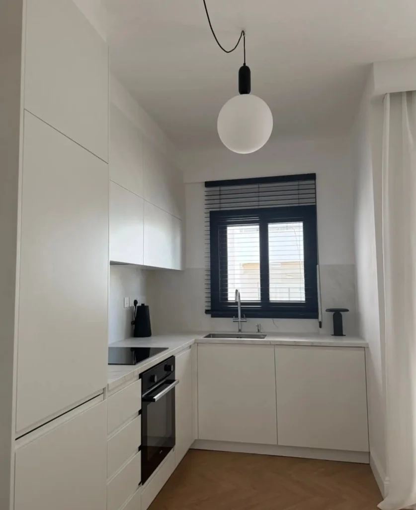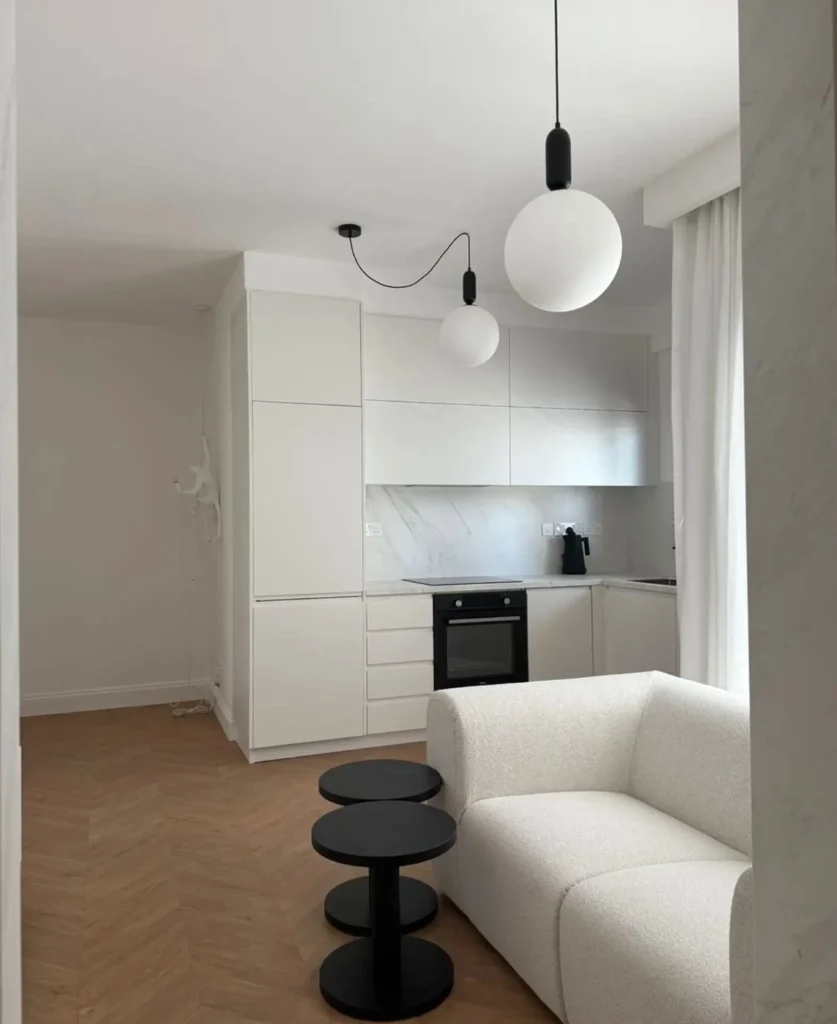 The apartment features a compact living area, a fully equipped kitchen, one bedroom, and a bathroom. It is fully furnished and designed for comfortable and practical living.