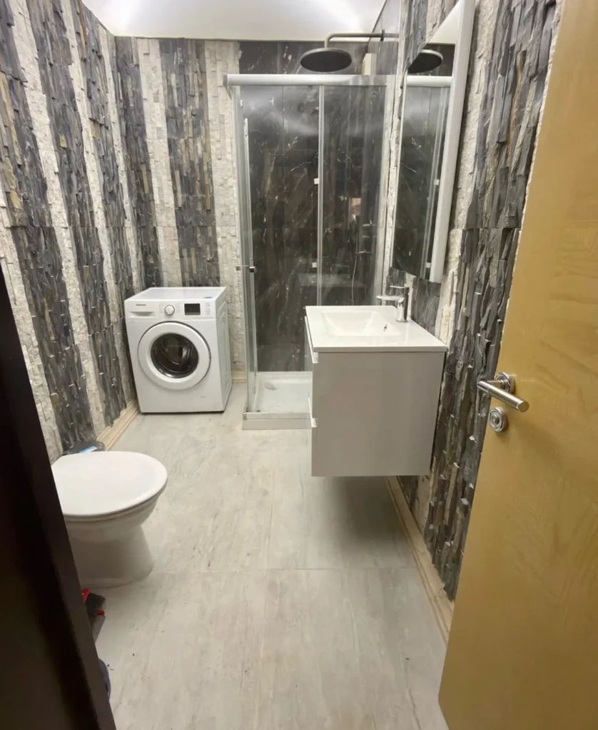 The apartment features an open-plan living area with a fully equipped kitchen, two bedrooms, and a modern bathroom with a walk-in shower. It is fully furnished and designed for comfortable living.