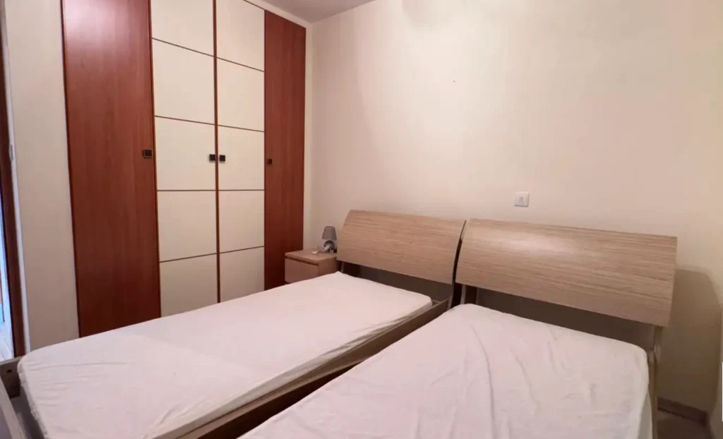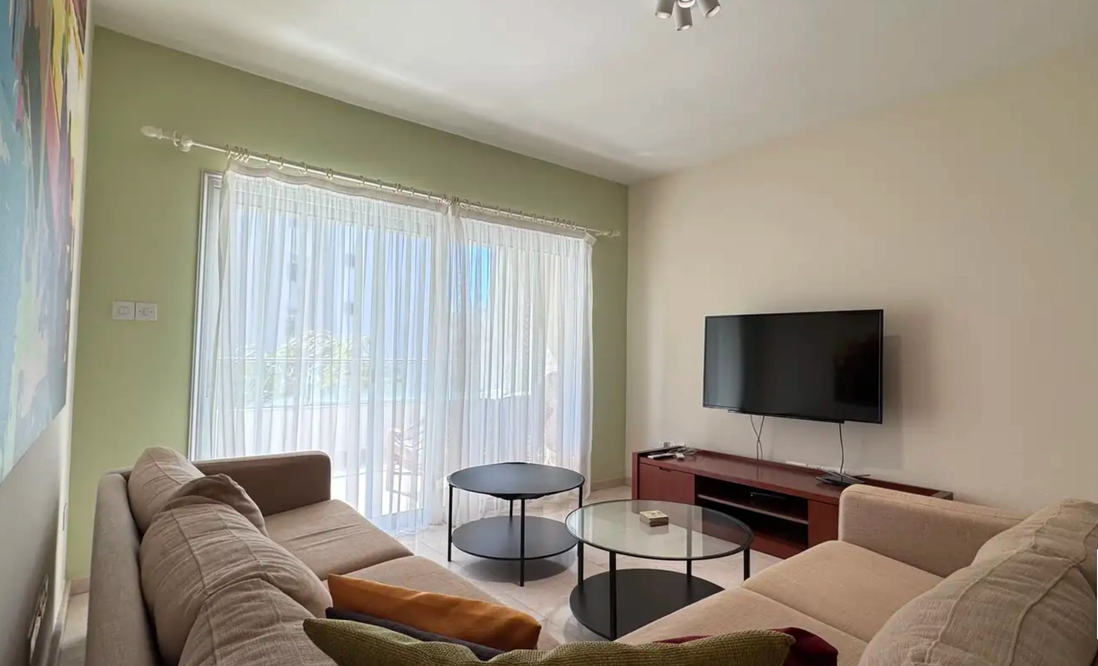 The apartment features a bright living area, a fully equipped kitchen, two bedrooms, and two bathrooms. It is fully furnished and designed for comfortable everyday living.
