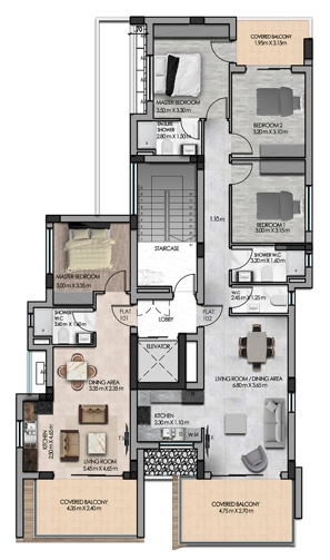The three-bedroom apartments are designed for those who value generous living space and comfort.