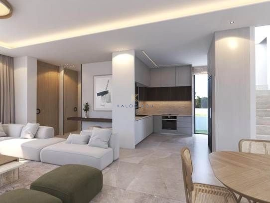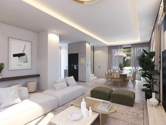 The open-plan layout unites living, dining, and kitchen areas into one fluid space, creating an ideal environment for gatherings, entertaining, or relaxing in everyday comfort. Expansive windows fill the interiors with light, while sliding doors open onto private terraces and landscaped gardens, allowing the Mediterranean lifestyle to be enjoyed both indoors and outdoors.