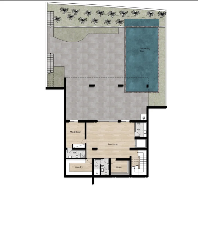 The upper and underground levels are accessed by a staircase in the center of the living room or an elevator. The second level situated three large bedrooms and a master bedroom with dressing rooms and en-suites. The third level is a roof garden and terrace for relaxation. In the heart of the courtyard area is a private swimming pool surrounded by landscaping and gardens.