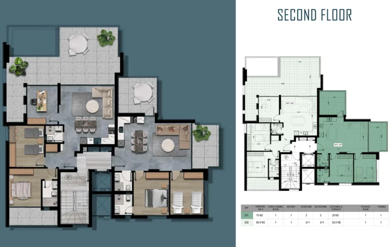 The two-bedroom apartment is designed for those who value space, functionality, and refined style. Its expansive open-plan living and dining area connects seamlessly with a modern kitchen and opens onto a wide veranda, perfect for enjoying the Mediterranean climate and breathtaking views.