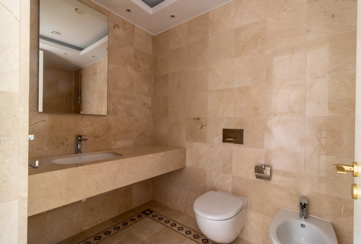 Bathroom floors and walls are laid with expensive sorts of marble and granites