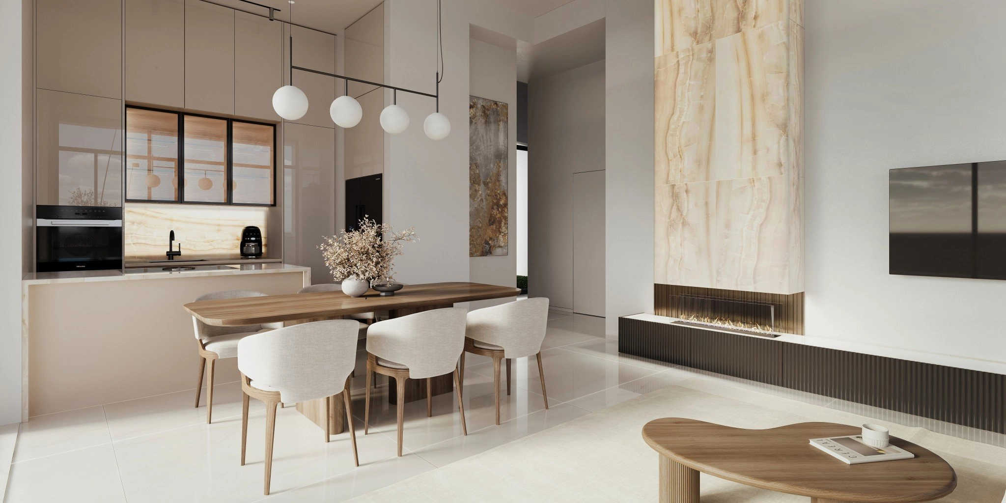The modern kitchen is sleek yet functional, designed with premium cabinetry, countertops, and appliances. Its spacious layout provides ample room for cooking and storage, while seamlessly integrating into the living and dining area.