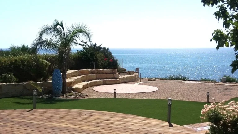 A beautiful seaside villa, located at Zygi just 20 meters from the coast. The villa consists of 4 bedrooms-5 bathrooms, some with steam bath- open plan salon with kitchen and unobstructed sea view – TV room- Moroccan style indoor heated pool area, sauna, salon and glass roof- roof garden with view of all surrounding area and beach – basement with home cinema, play room, bedroom and 2 cover parking places – The villa has large verandahs with sea view and beautiful landscaped garden with stones, mosaics, sculptures. Additionally, the villa has a glass door elevator for all floors, cellar, 3 storage rooms, 4 cover parking places, smart house system, Internet, CCTV cameras, alarm system, lighting system, Intercom telephone system, central music system, solar storage system, floor heating units, air-conditioning system, fire place and wall and floor mosaics in bedrooms and sitting areas.