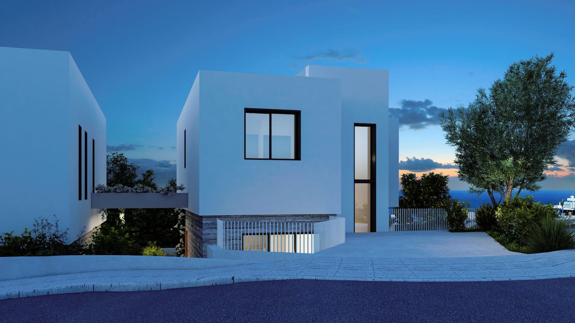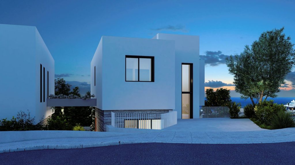 These 3-bedroom magnificent villas for sale in Paphos, ingeniously blend the use of white finishes and fair face concrete, with decorative walls also featuring concrete blocks.