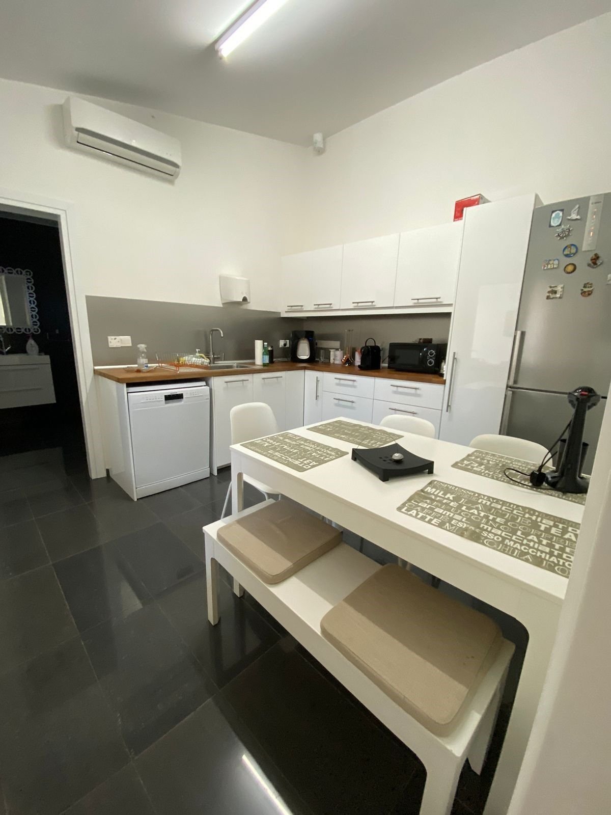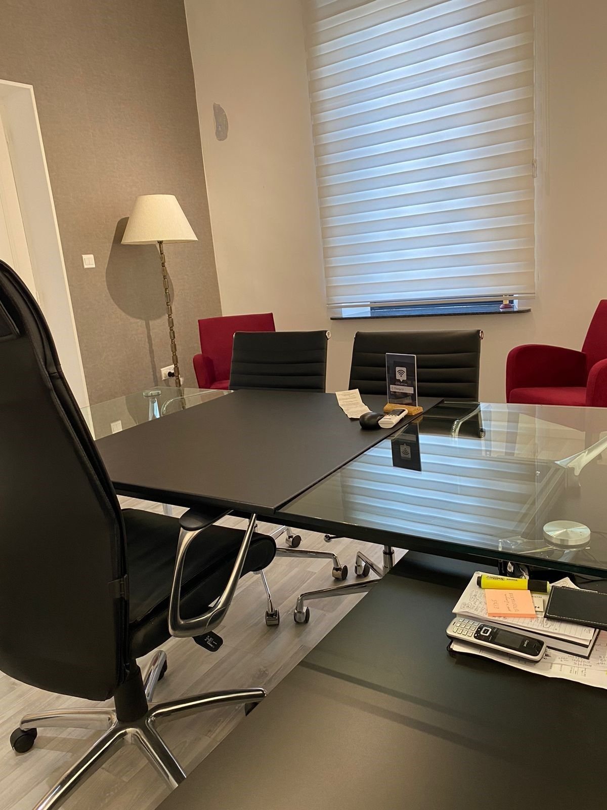 Hosting an entrance hall with high ceilings and large double rooms on either side. A kitchen area and 3 wc's and bathroom.