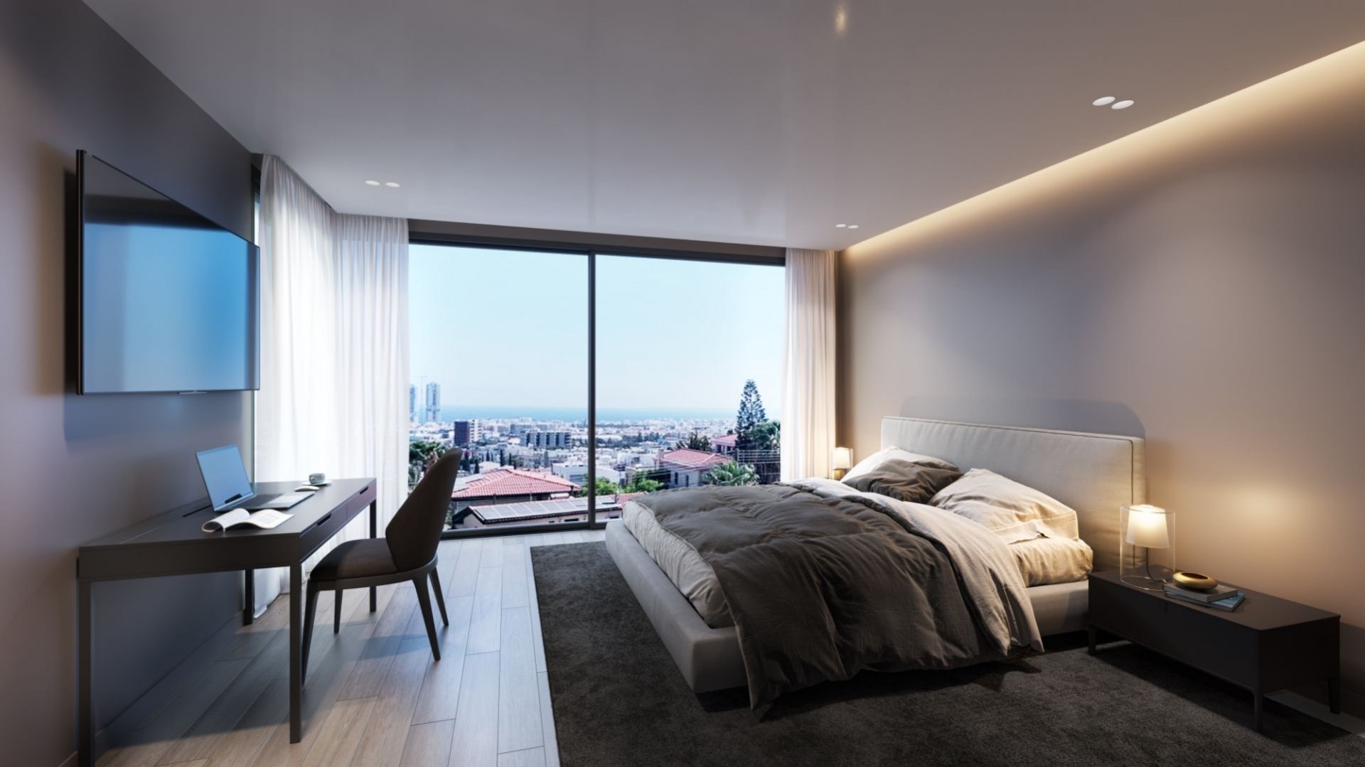 Step in to the bedrooms, where dark neutral tones and parquet floors exude a sense of sophistication. The large windows frame panoramic sea views, allowing