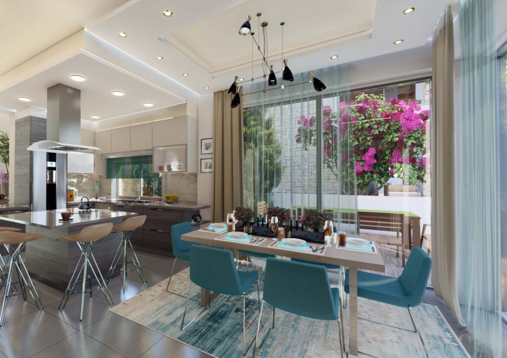 Entering the house, you are greeted to a big spacious open-plan layout with an L-shaped kitchen and an island counter. Towards the back side of the ground floor, you find a spacious bedroom with an en-suite bathroom and finally the powder room next to the staircase in the corner that takes you to the first floor.