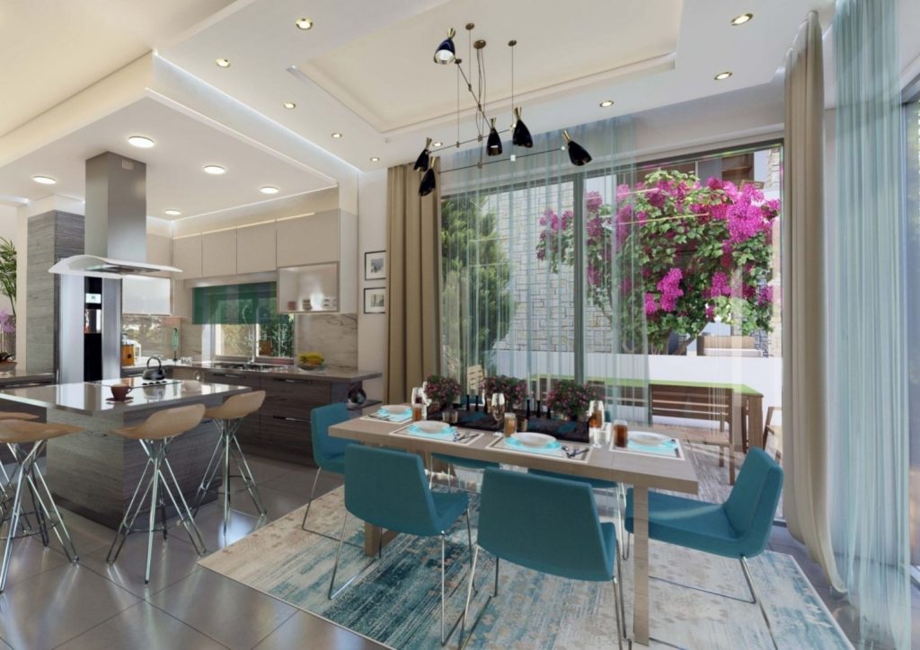 Entering the house, you are greeted to a big spacious open-plan layout with an L-shaped kitchen and an island counter. Towards the back side of the ground floor, you find a spacious bedroom with an en-suite bathroom and finally the powder room next to the staircase in the corner that takes you to the first floor.