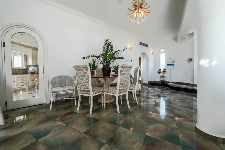 It is 1 floor high and it also includes an immense roof terrace and a huge basement that hosts lots of leisure space and a utility room with an en-suite bathroom. Looking at the property from the front, you see beautiful stairs leading you up to the entrance with an infinity edge swimming pool by its side with lots of patio area.