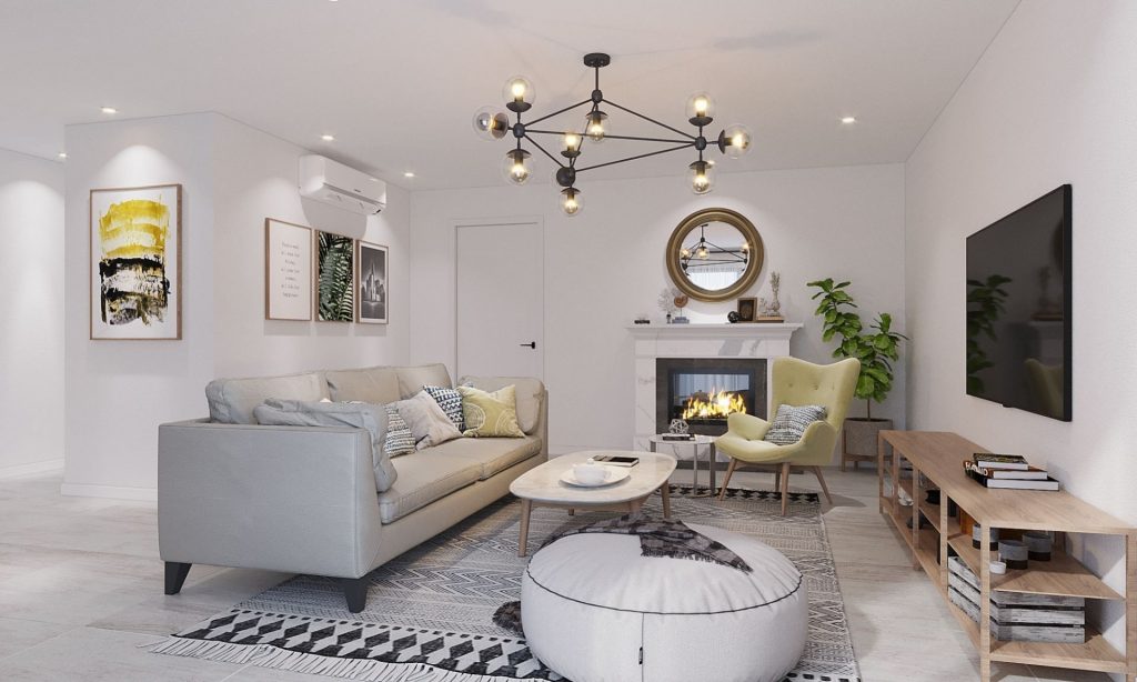 The living room space is spacious, with a cozy Marble fireplace, 3m high ceiling , and separated from the kitchen.