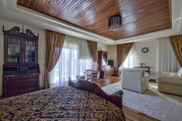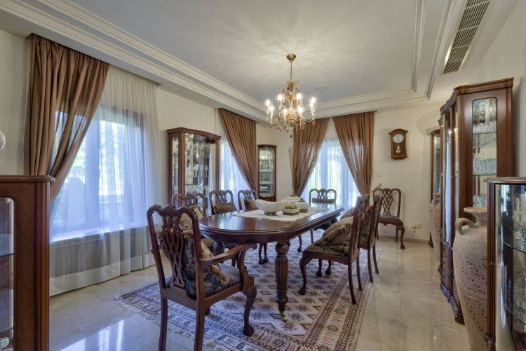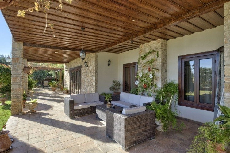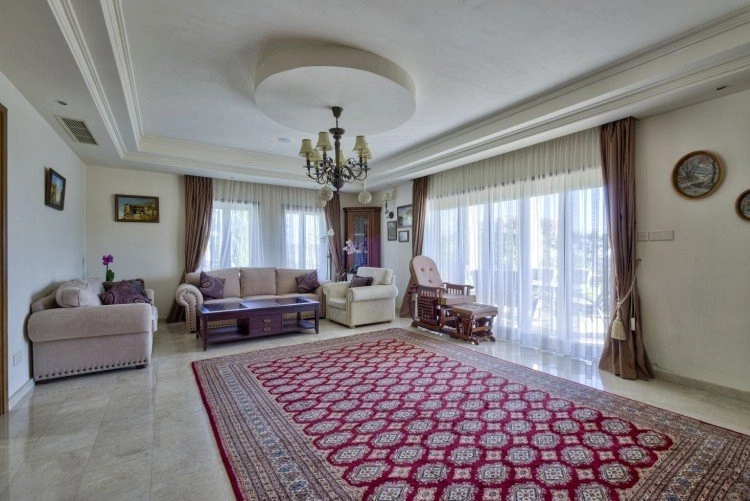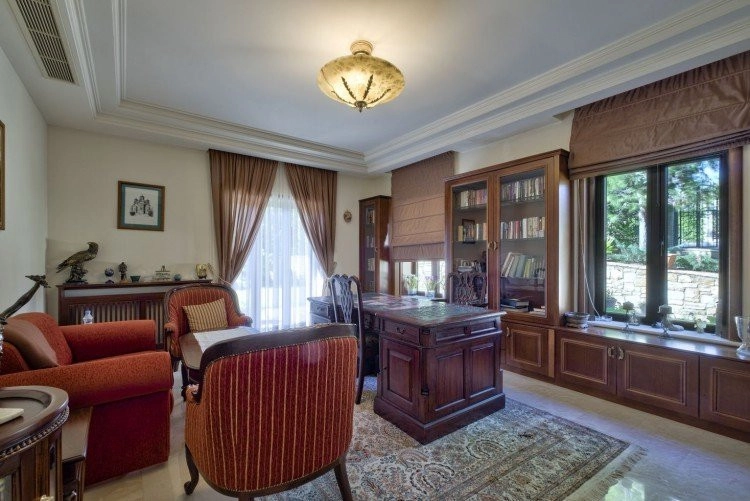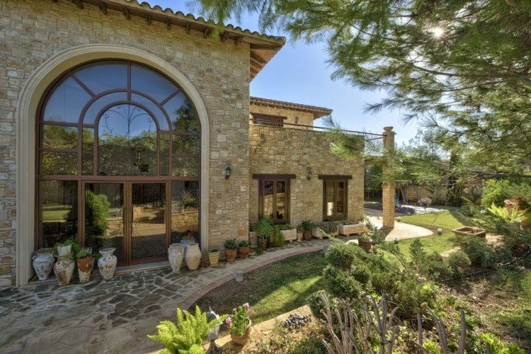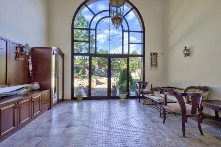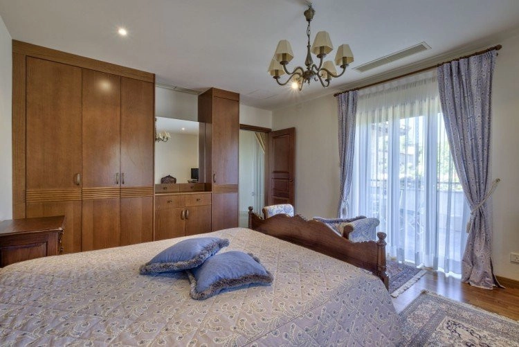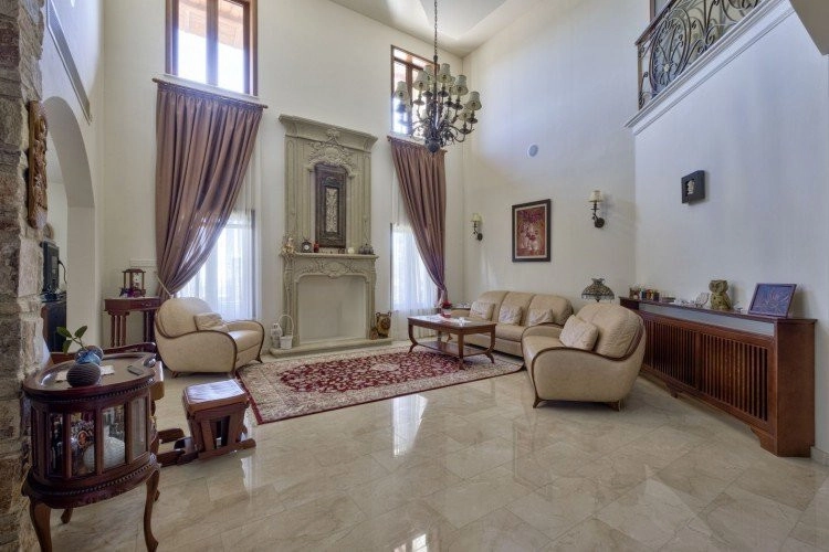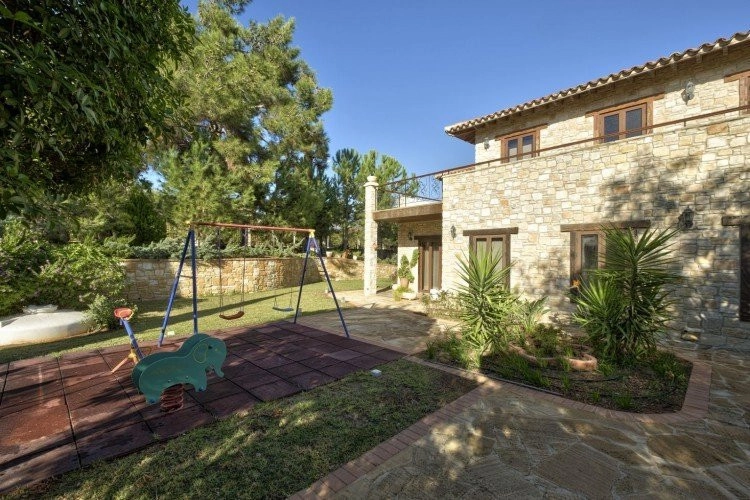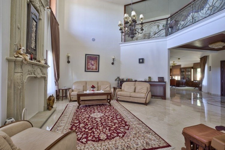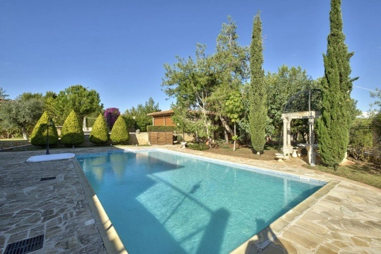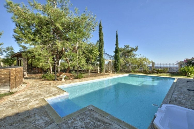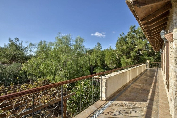 Main House: 440m2,Guest House: 100m2 2 studios 50m² x2, Plot: 3911m2 House consisting of: A. Ground floor: kitchen – family room, utility room, living room dining room, entrance hall, a master suite with separate dressing area and en-suite bathroom, guest’s toilet and study. B. 1st Floor with a landing hall, two bedrooms both en suite, large balconies all around the house. 5. Stone wall boundary with iron bars and 2.20m high electric gate remotely controlled entrance door – video/audio link to the building. 6. Preparation for irrigation system with a complete water system connected to own water well. 7. Preparation for satellite and ADSL / Broad band connections. 8. Solar and electric water heating system. 9. A pergola 3m x 6m with lighting. 10. 250m² of Crazy paving. 11. Preparation for 18 perimeter lights (lighting fixtures for in and outside the house will be supplied by the Purchaser). 12. Tiled roof bar with BBQ. 13. 4 Garden water/hose connections to own water source 14. Covered sitting area with fire place 15. 100m2 guesthouse with two en suite bedroom and kitchenette 16. Alarm System 17. Reclaimed roof tiles on top of specially imported corrugated cement based sheets 2. One single stone built garage 4 x 6 m with remote control door. 3. 20m2 outhouse with sauna, toilet, shower and changing room 4. Swimming pool 6m x 12m (maximum depth 1.6 meter) with built in spa. Double glazed aluminum windows, Designer kitchen , Parquet wood in bedrooms, Ceramic tiles or marble downstairs, Entertainment and Energy management System,. Central heating Air conditioning.