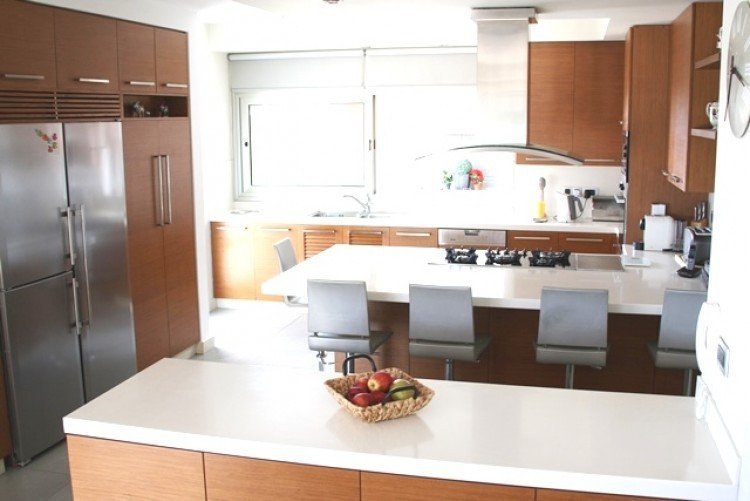 kitchen with facilities for 6 persons dining, Miele appliances . Fridge – Liebherr three door. Multiple wood cabinets and double stainless steel sink, Grohe mixer, kitchen work tops in original Corean – DuPont composite material.