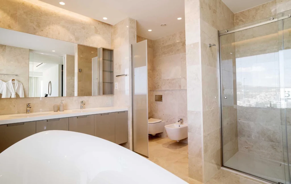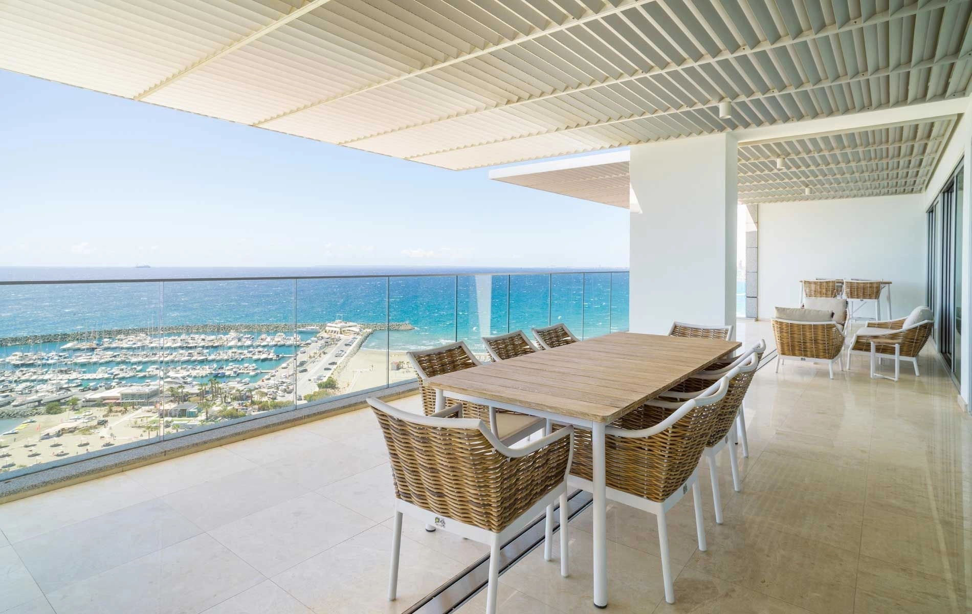 If you are looking for the best Cyprus has to offer, then look no further. This luxurious villa on the top of this amazing residence is a two-storey penthouse on the 11th and 12th floors (level 13 and 14). The twelfth and highest floor boosts the most magnificent views in Limassol, overlooking the private marina, gardens and simply the whole Limassol Bay with unobstructed and unrivalled views. The penthouse has every top-quality finish, with Crema Marfil stunning marble, top Italian brushed gold and wooden tailor-made kitchen, an office and four large bedrooms, all with ensuite. The kitchen has its own service entrance, a must for entertaining and there is a large, covered terrace on the 12th floor. The bedrooms are all situated on the 11th floor and there is a beautiful sweeping staircase connecting the two levels. All amenities have been considered in this state-of-the-art penthouse and every smart home option has been incorporated. There is a large walk in wardrobe in the master bedroom and breath-taking views can be enjoyed from the freestanding Villery & Boch bathtub.