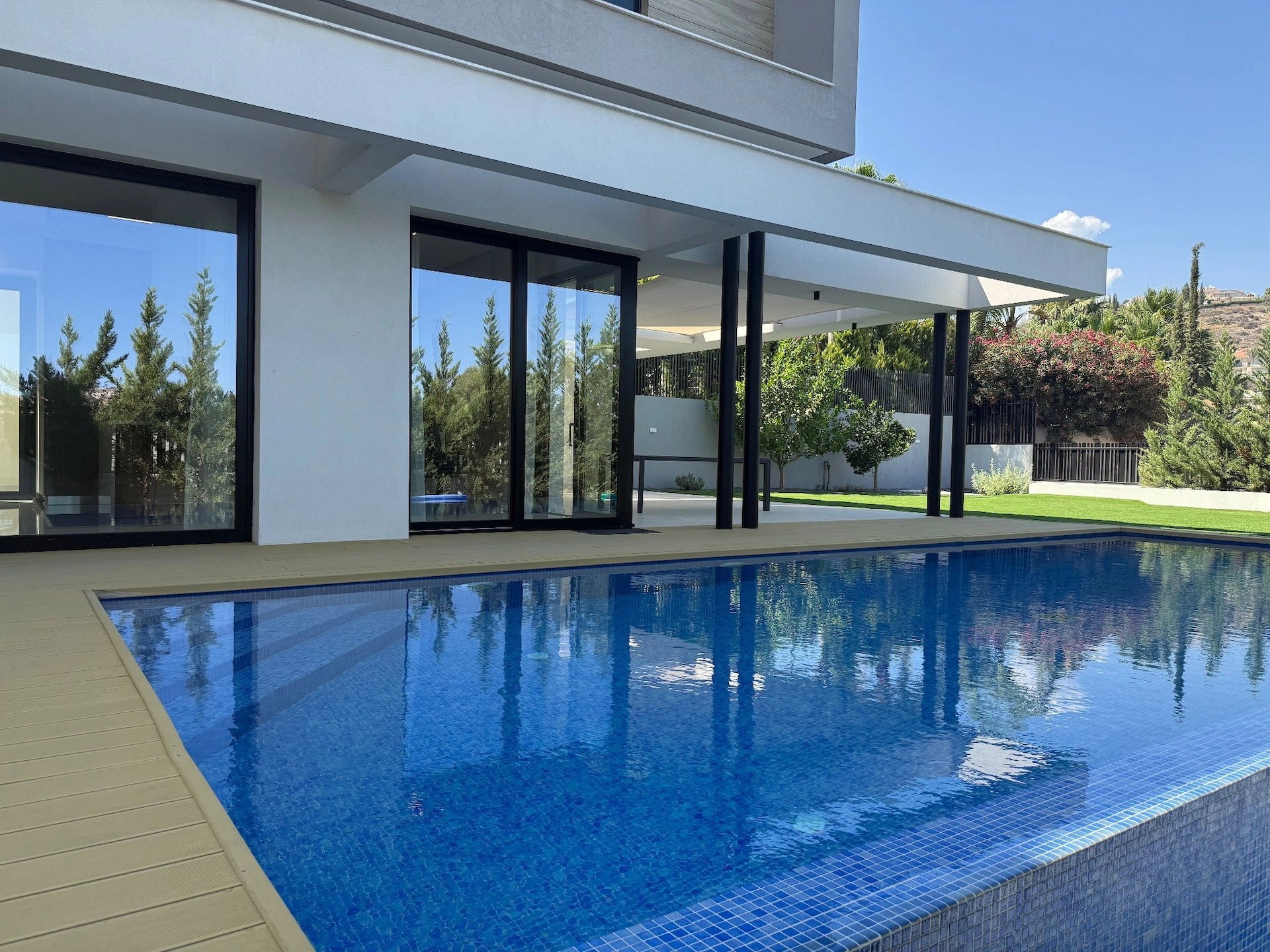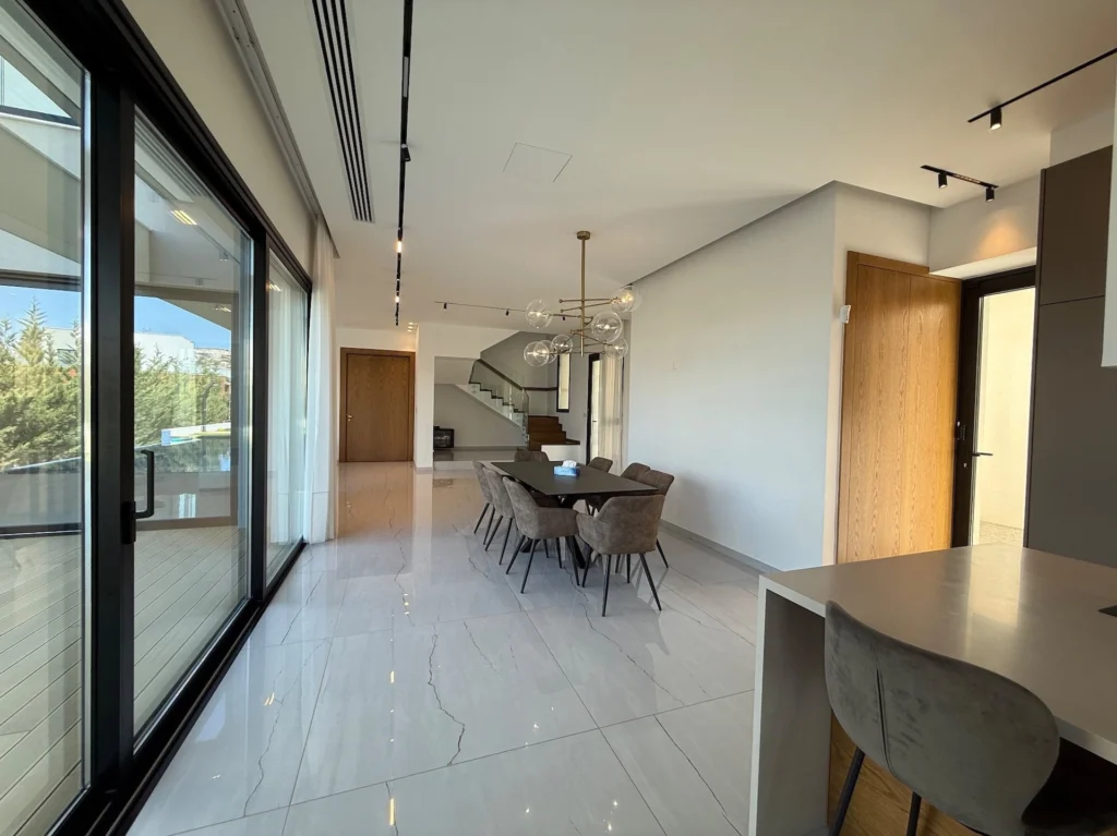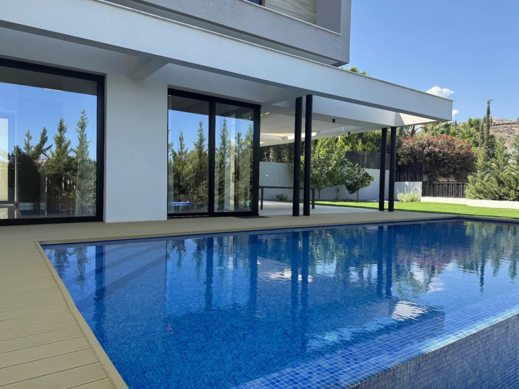 This outstanding property is in the sought after location of Agios Tychonas.All bedrooms are en suite. Master with walk in wardrobe.Maids quarter.Modern fully equipped kitchen with island bar, comfortable sitting/dining/lounge areas, high ceilings with patio doors accessing the gardens and the overflow swimming pool.Guest wc, landscaped gardens, covered parking, fully a/c throughout, under floor heating, secure gated entry to the house.The highest quality throughout with no expense spared.