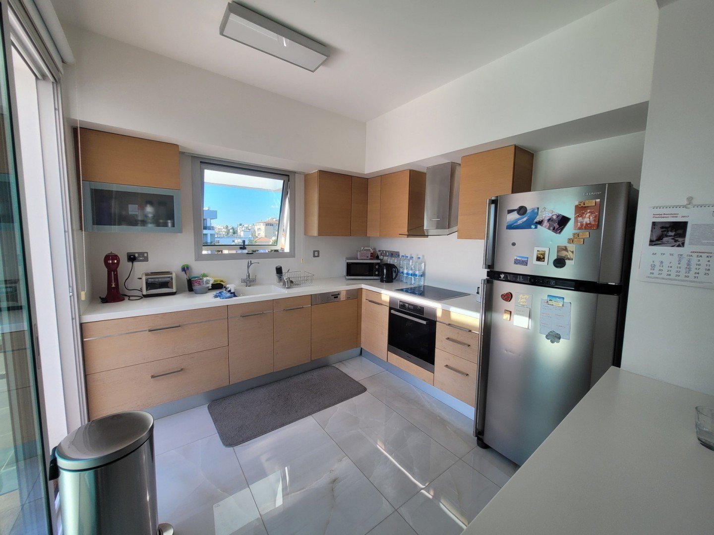 We are happy to present you this luxury, modern design, 3 bedroom penthouse, located in Neapoli area just few meters away from the beach. This beautiful well maintained apartment is situated on the top floor of a 4 storey building, and only ten years old. Property owns the whole fourth floor. It has internal area 115sqm, 36sqm covered veranda and another 80sqm uncovered veranda. The apartment has a nice open plan kitchen with living room and dining area, both facing the nice huge veranda with windows, guest wc, main bathroom, master bedroom en suit with toilet and shower and another two big size bedrooms. Outside on the huge veranda there is much space for barbecue area and there is also a Jaccuzzi . From the big veranda you have partial sea view, mountain and city view. This lovely apartment which is in excellent condition, is equipped with ac units throughout, energy saving heating system, automatic blinds, led spotlights, covered parking and a storage room. The apartment has a clear title deed and is ready for transfer to the new owner.