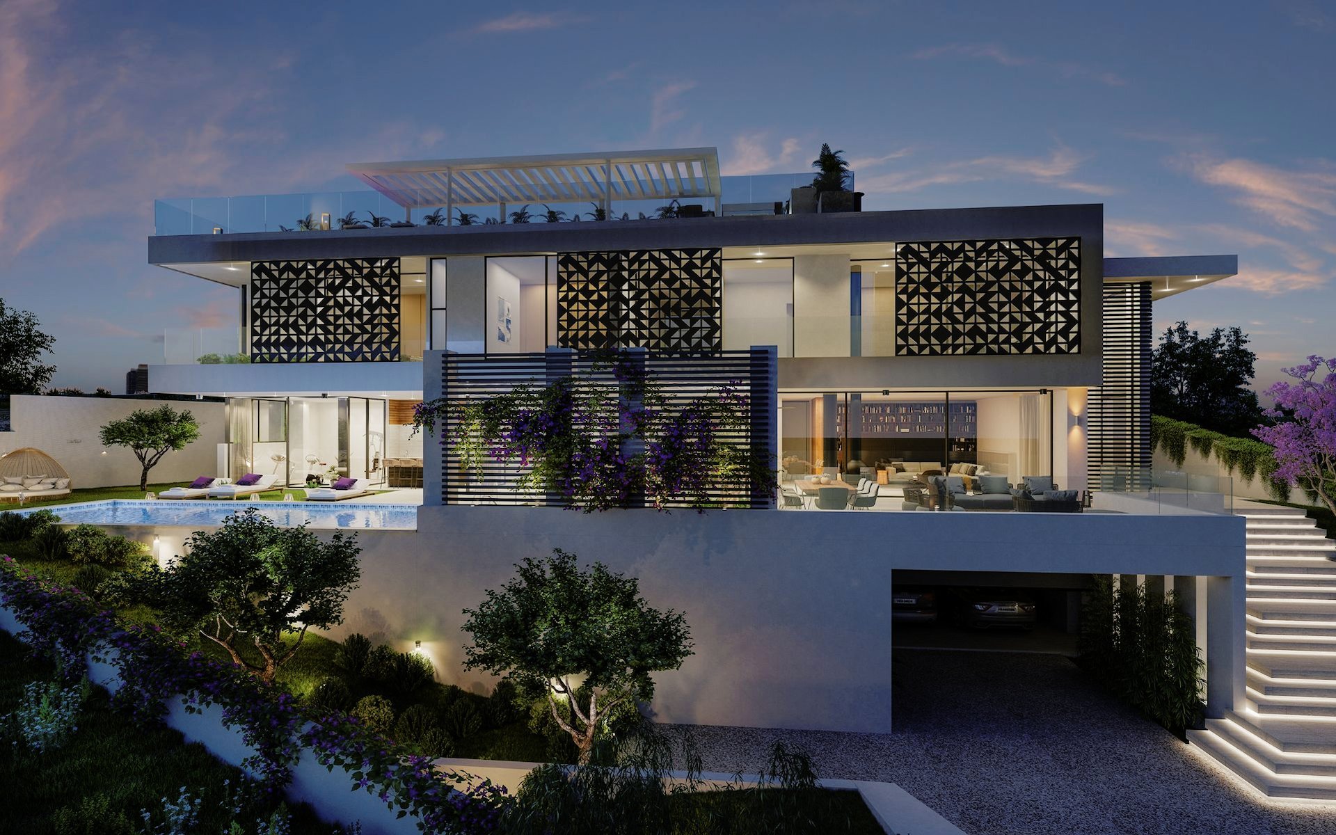 stunning interior elements that feature high ceilings and advanced amenities: modern kitchen, space for gym with shower, Jacuzzi, spa, maid’s rooms, a lift to all levels, spacious garages, beautiful balconies, a sunken seating area, and lush poolside landscaping.