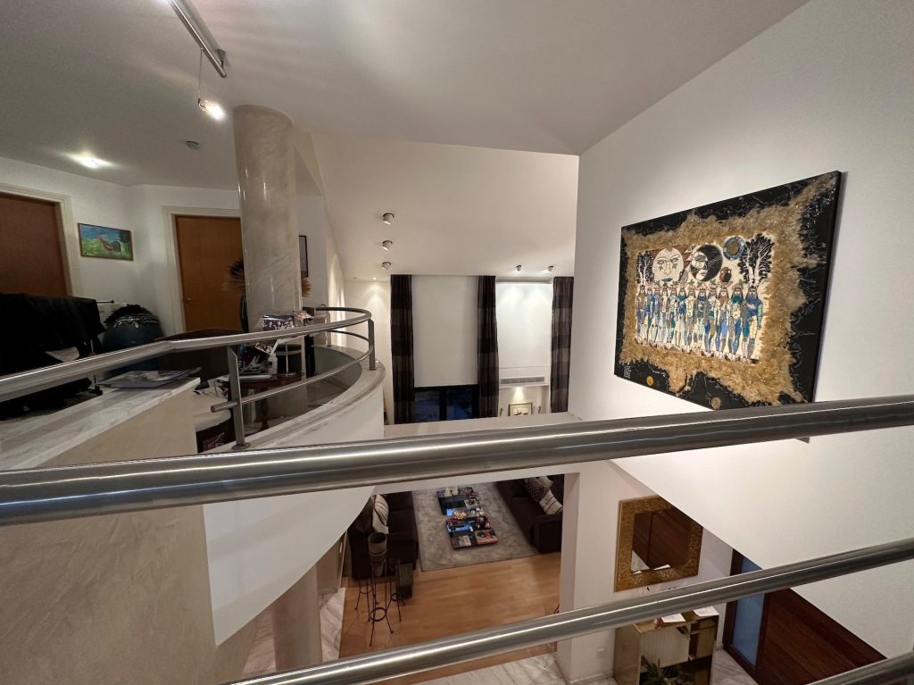 From the upper level the feature staircase and landing look down onto the ground level which has fabulous feature high ceilings.