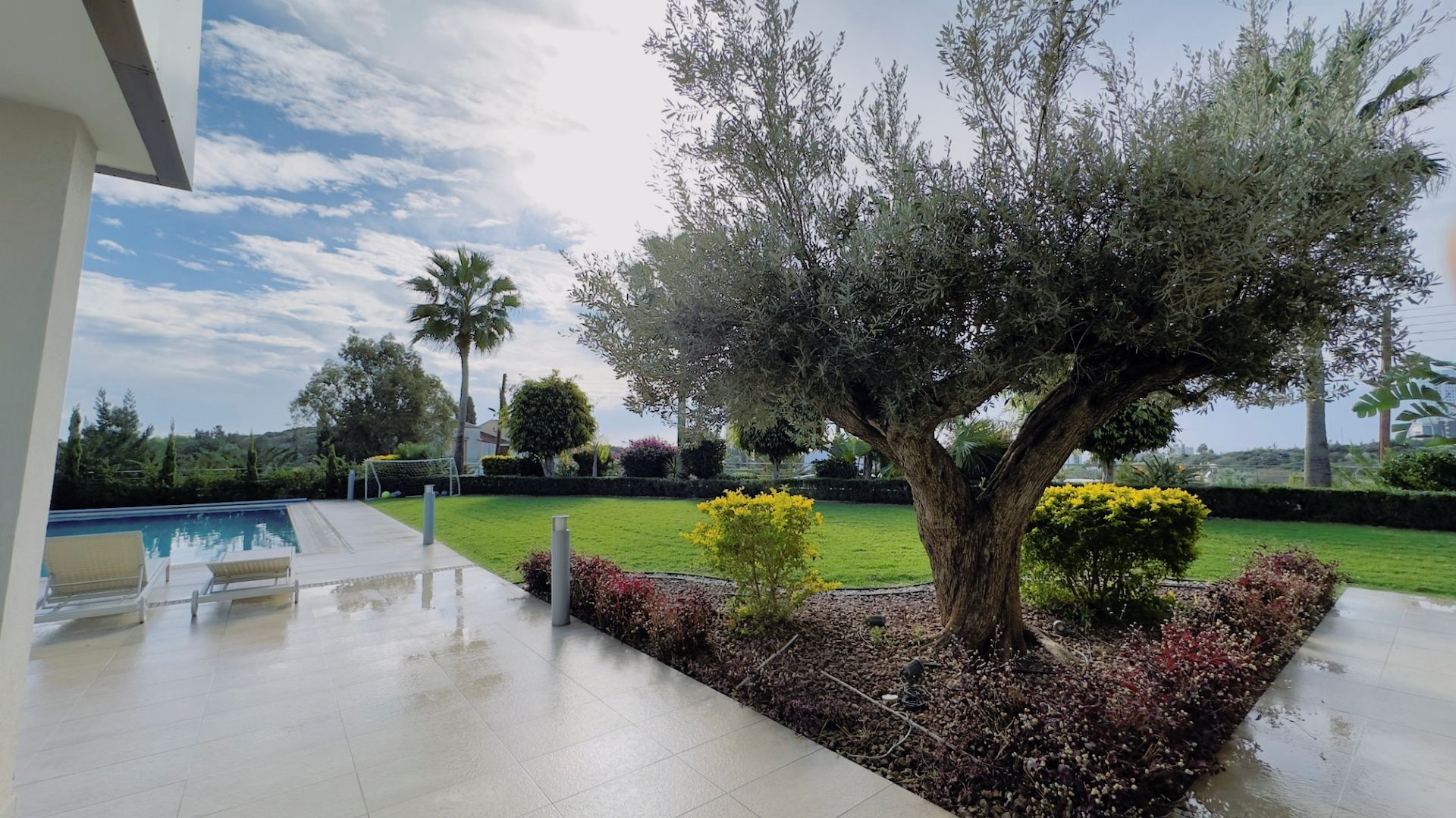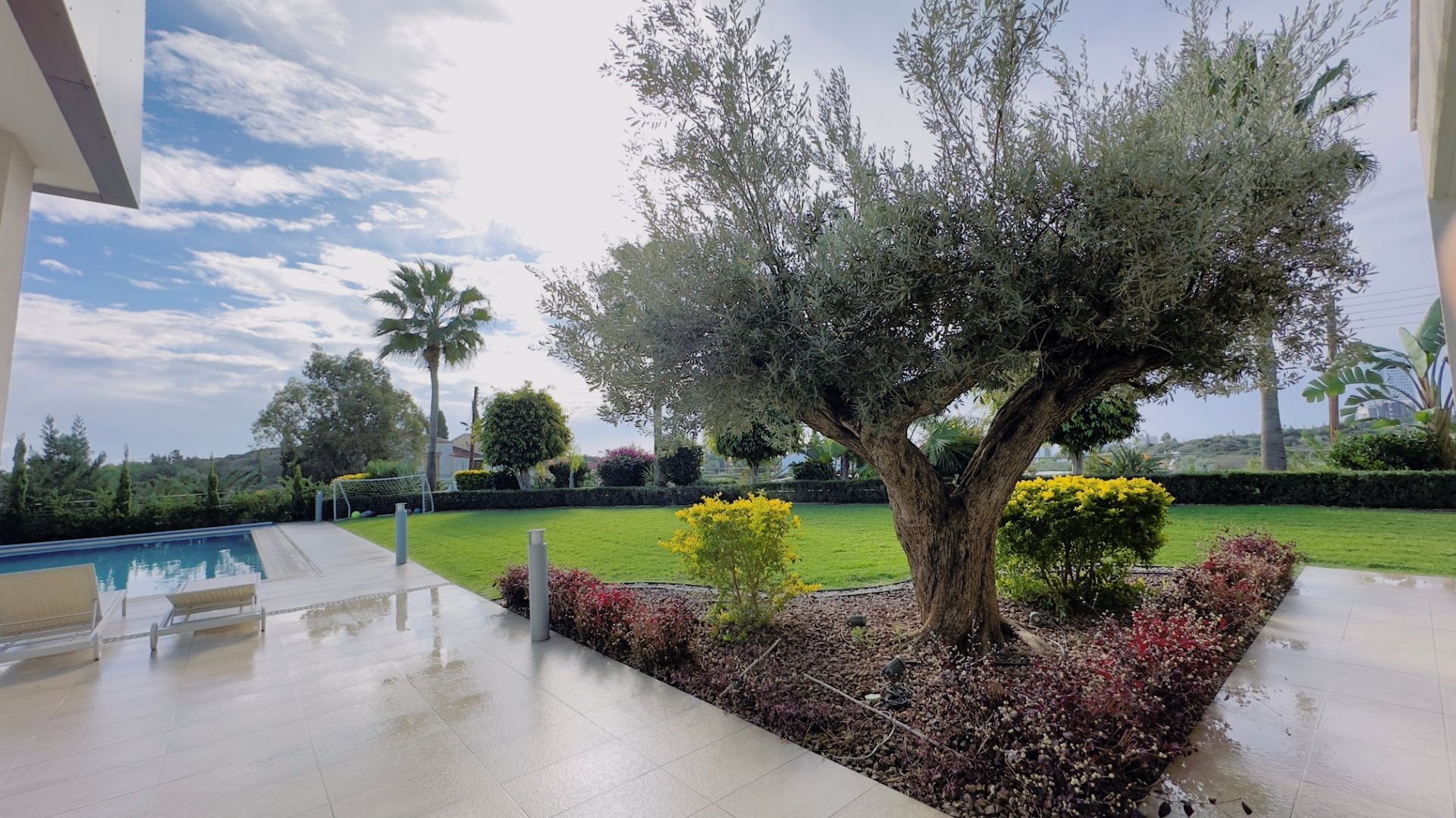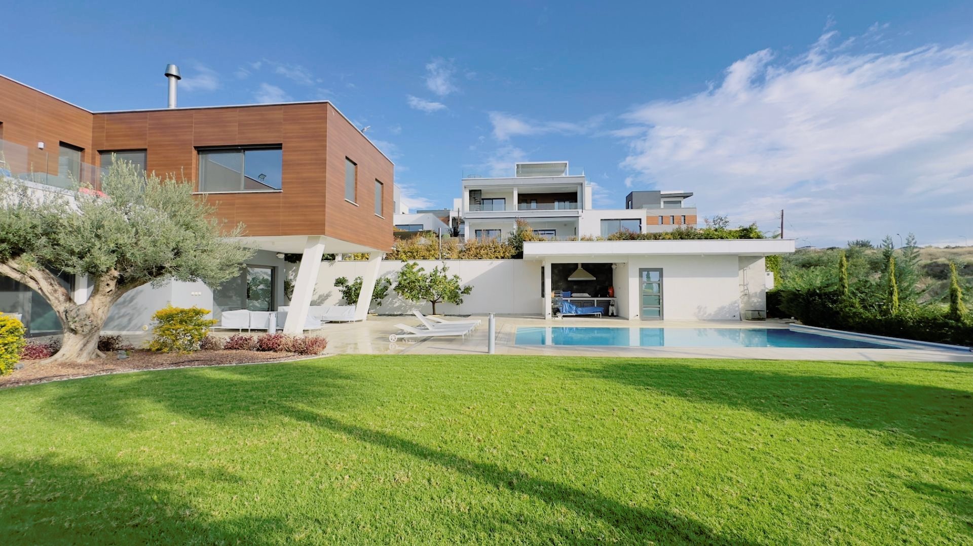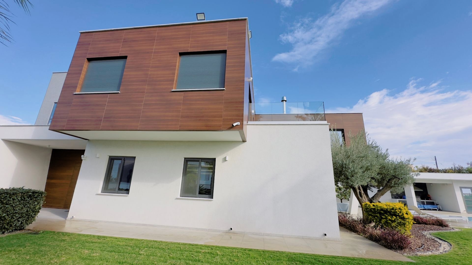 The property with an internal area of five hundred thirty two square meters is custom designed to carry a well-appointed unique, modern look. The villa includes private parking, landscaped garden, heated swimming pool, outside sitting area and large balconies.