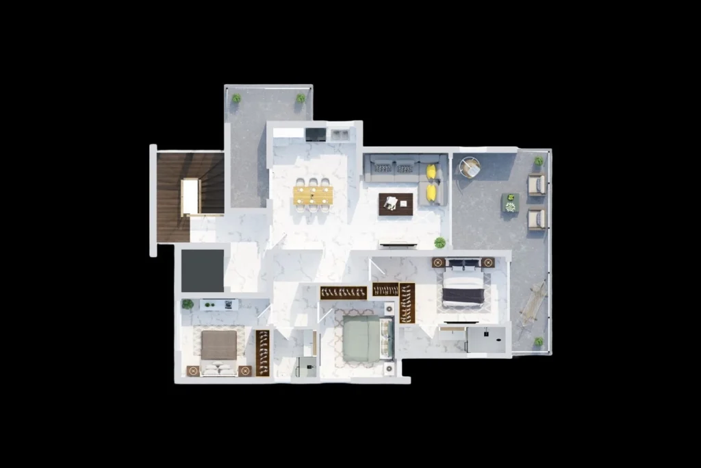 Spanning 101 sqm of internal space, plus a generous 34 sqm covered veranda, the apartment features a stylish open-plan layout that seamlessly connects the kitchen, living, and dining areas. It includes a guest WC, a main bathroom, and three spacious bedrooms. The master bedroom boasts an en-suite bathroom with a toilet and shower.