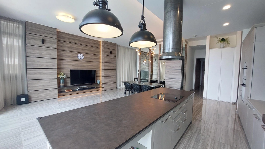 A: The apartment comes fully equipped with high-end finishes, including Scavolini kitchens and bathrooms, Atlas Concorde tiles, VRV air-conditioning, underfloor heating, and top-quality furnishings. Additionally, the apartment includes furniture, electrical appliances, and curtains.