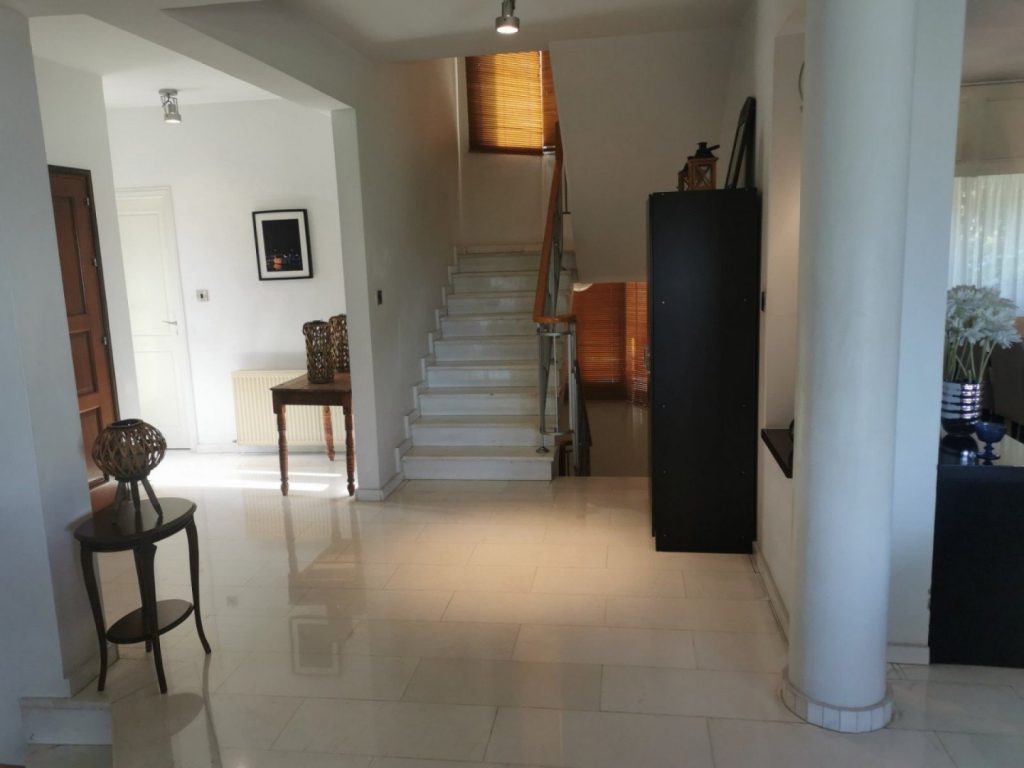 Lovely five bedroom villa in Agios Tychonas with swimming pool and sea view is available now.It has internal covered area 431 square meters and plot size 954 square meters. There is separate kitchen with two living rooms , one sitting room, two dining rooms and a guest w/c. Also there is a fire place, store room and one utility room.There are four bedrooms and one of them has en-suite bathroom, all with fitted wardrobes and a family bathroom on the first floor. Outside of the building there is a nice big garden with trees and flowers, with automatic watering system , large covered parking space for three cars with electric gate and barbecue.There is a maids-room , playing room and kitchenette. The aluminium doors and windows are double glazed with security locks. It has solar water heater with pressure. Also it has security system , alarm system, a/c in all areas diesel central heating and water drilling .The house is located on a hill of Agios Tychonas with view of Limassol and is only five minutes drive from the sea and ten minutes drive from Limassol City.Located in a quiet ,nice area surrounded by nice houses at a dead end road.It has quick access to all needed amenities including supermarkets, parks,schools, restaurants and beach.