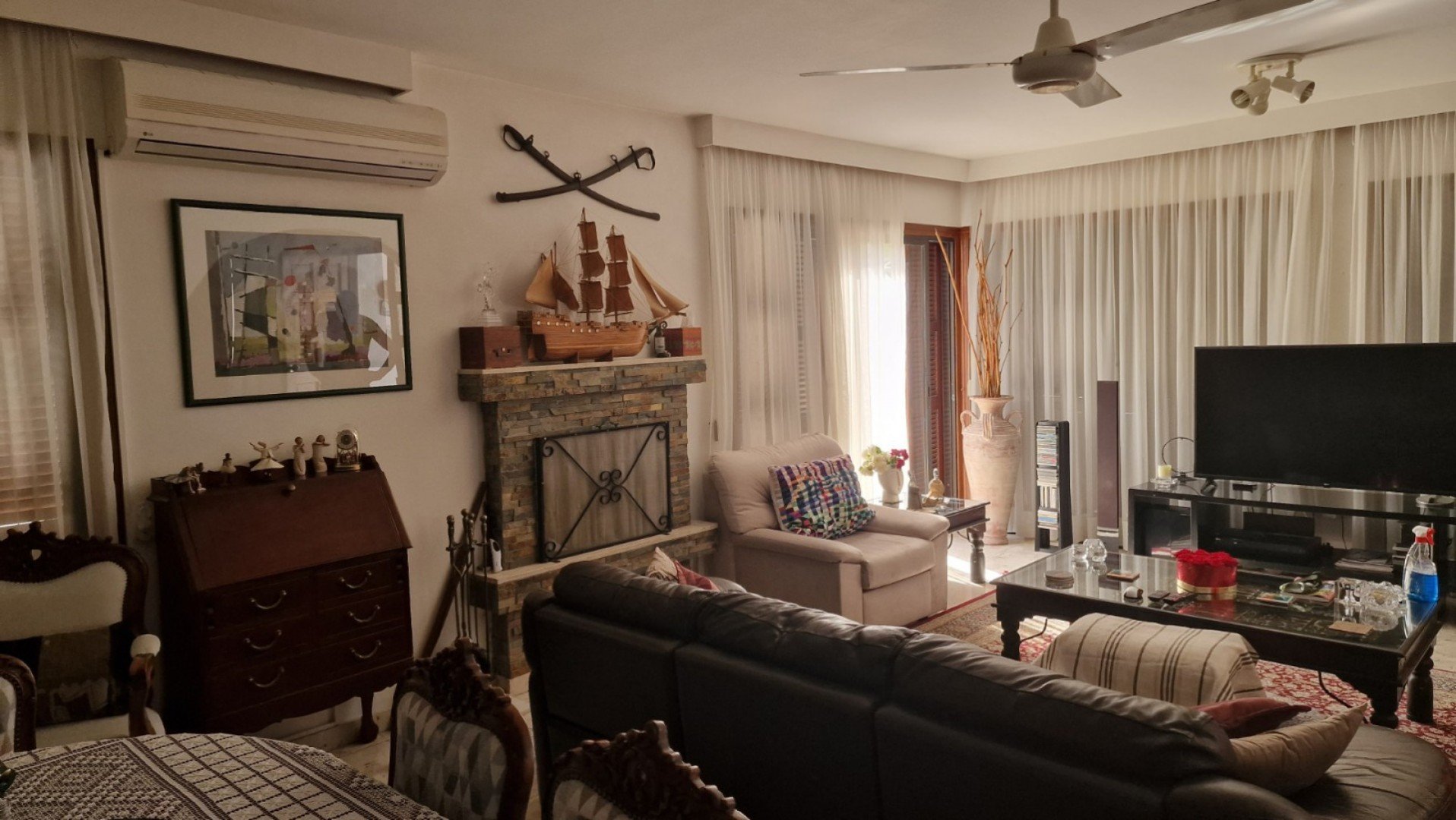 Το πραγματικό σπίτι είναι σε 3 επίπεδα, το υπόγειο έχει δωμάτιο υπηρεσίας με ντους και μικρή κουζίνα, αποθήκη και γκαράζ.