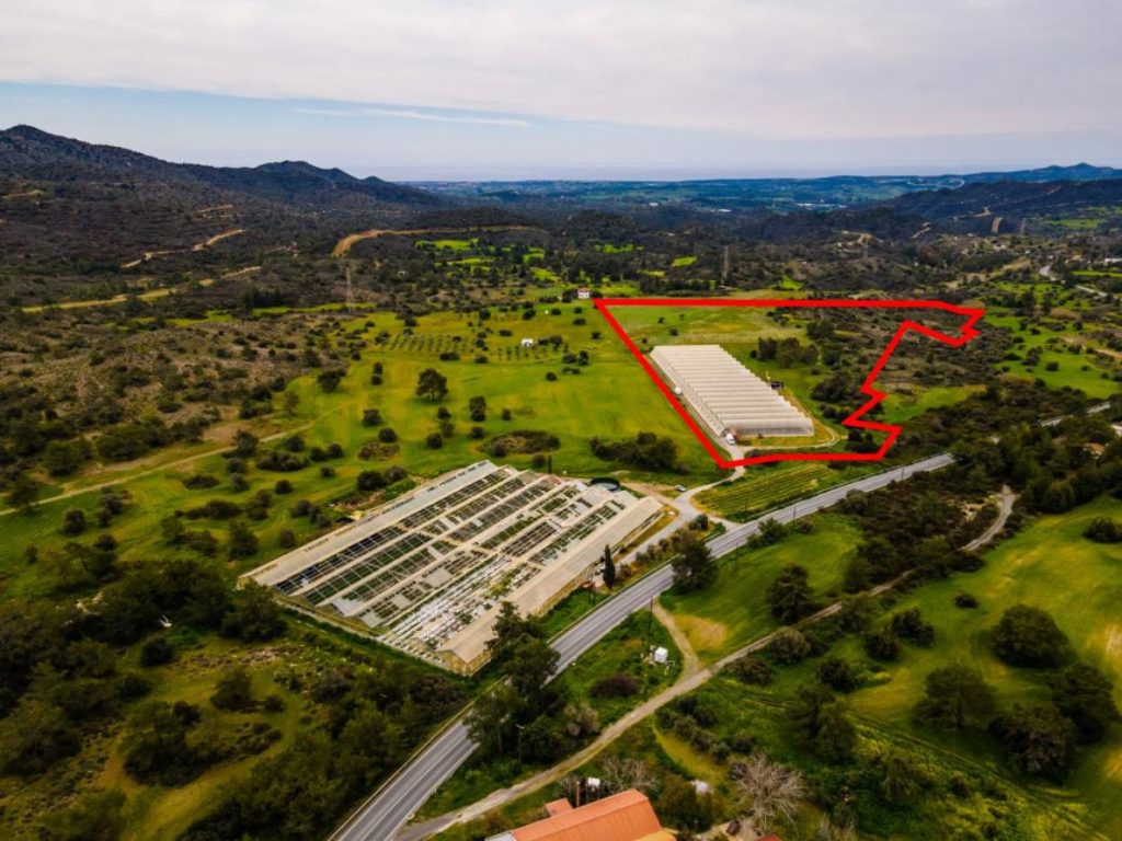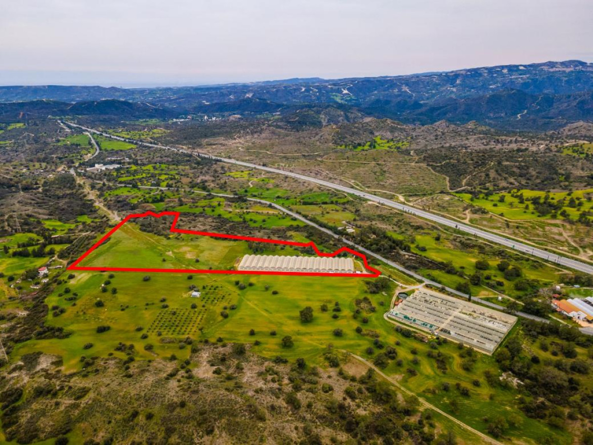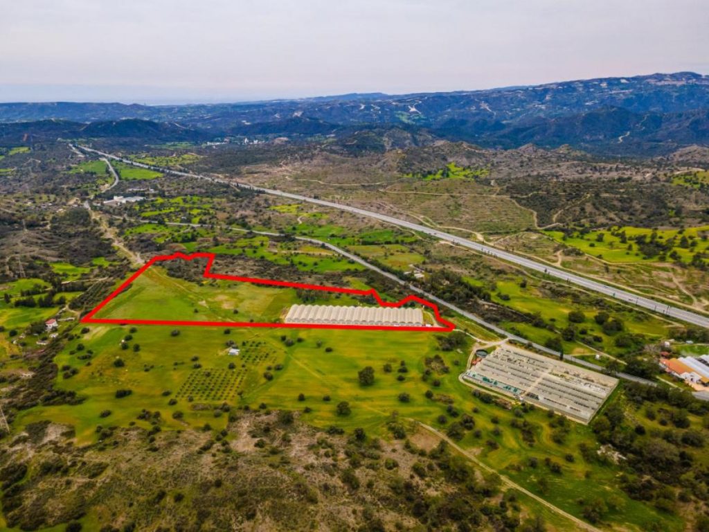 The property is a large agricultural field in Kornos. It is located 220m from Nicosia-Limassol highway. The field has an area of 66,220sqm and within the field there is a greenhouse of 5,000sqm. It benefits from a 6m-wide right-of-way. The immediate area of the property is mainly agricultural and offers easy access to the Nicosia – Limassol highway. Occupancy Status: Occupied