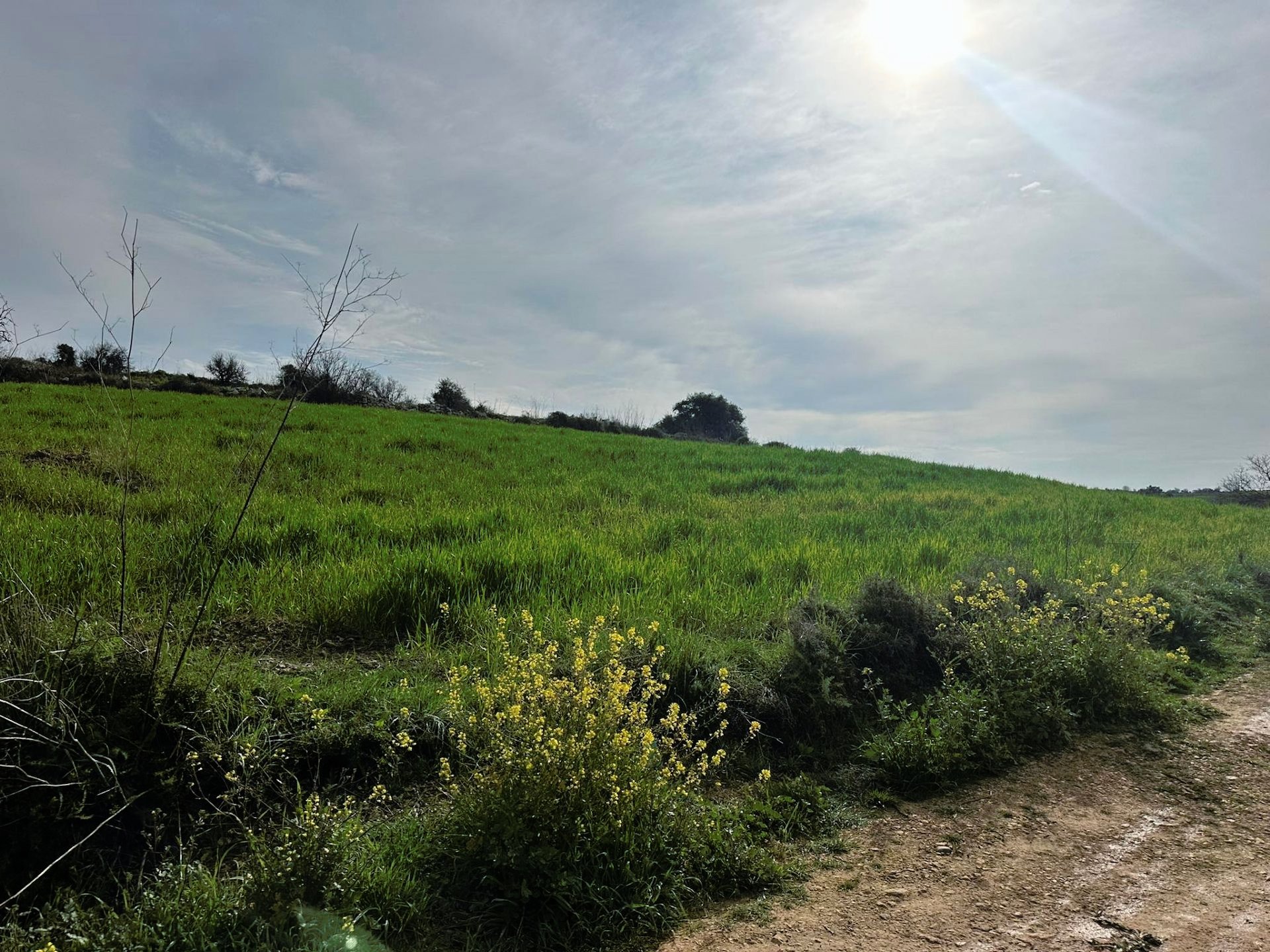 It has a regular shape with a slightly slope surface and it abuts to a dirt road.