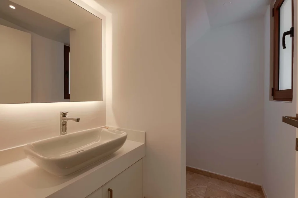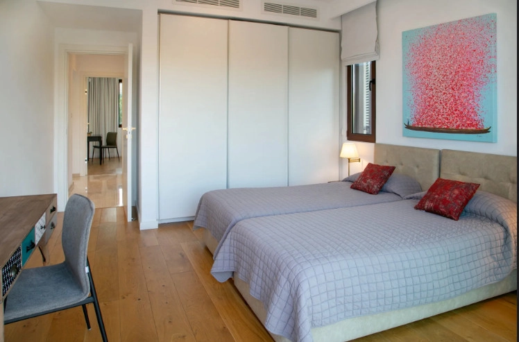 All three bedrooms are on the first floor with parquet flooring and large fitted wardrobes. Two of the bedrooms have direct access to a large terrace, offering breathtaking scenic views.