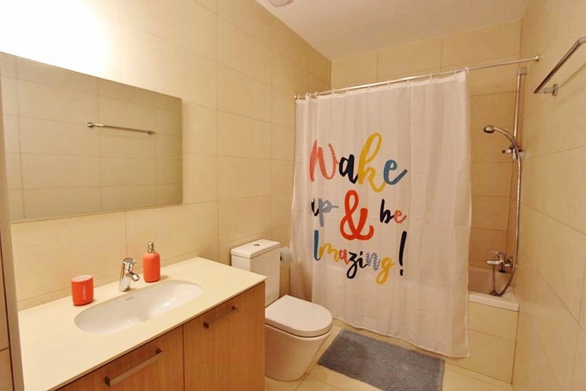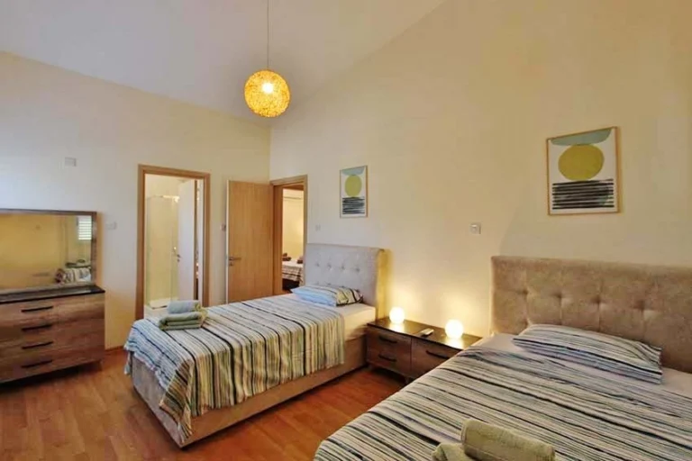 Open-plan living room with a kitchen and built-in appliances. The main bedroom has a large double bed, an ensuite bathroom, and a separate exit to the pool terrace. Another bedroom (with two single beds) also has an ensuite bathroom with a shower, and the other two bedrooms are equipped with double beds and built-in wardrobes, with a spacious bathroom with a bathtub for them.