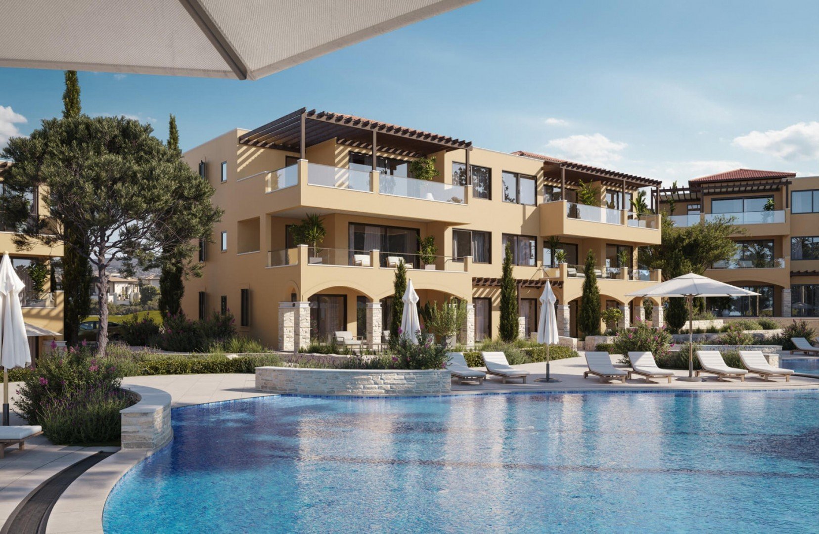 Located in a prime position at the centre of Aphrodite Hills Resort, each apartment block boasts an uncompromising attention to detail that is synonymous to the high-end real estate choices offered at the multi awarded Resort. These beautiful, spacious apartments are set in 3-storey buildings with just 6 homes to each unit and share wonderful views over the large free form communal swimming pool, Golf Academy and to the blue Mediterranean Sea.