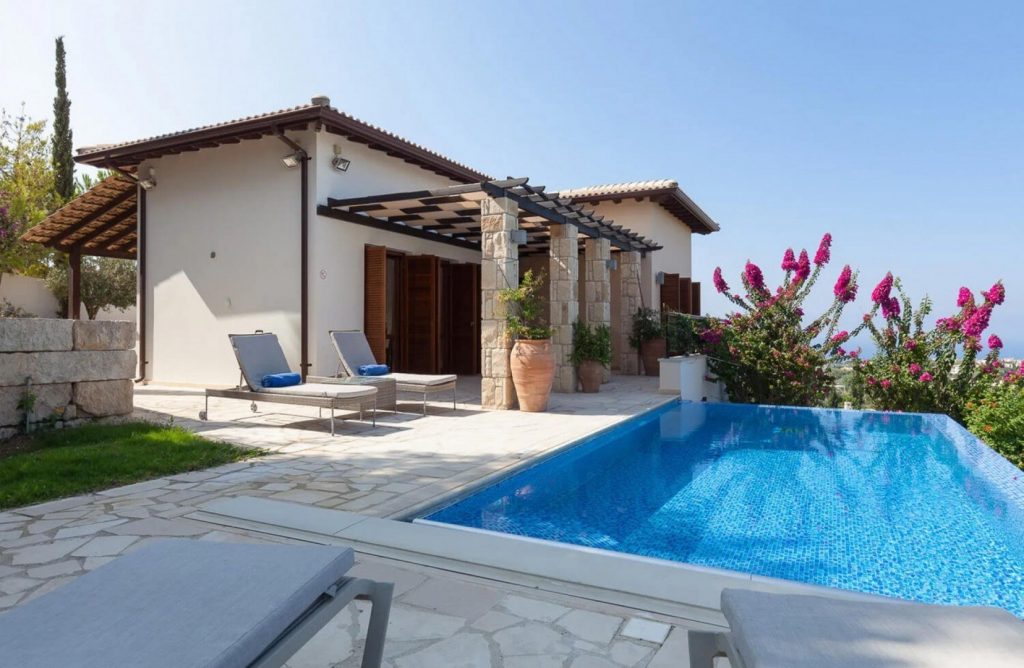 This lovely 2-bedroom cottage with stunning views of the Aphrodite Hills Golf Resort, the sea and the mountains is located on a large plot on one of the highest points on the Resort.
