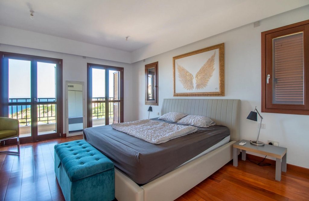 The marble staircase leads up to the first floor, with three more bedrooms and even more wide-sweeping sea views. The master bedroom is exquisite, with beautiful furnishings giving a true sense of luxury. Featuring a sumptuous king-size bed and shuttered French doors opening out to the balcony from where one can take in the panoramic views, and an en-suite bathroom which is fully tiled in granite offers twin washbasins, WC, bath and separate shower.