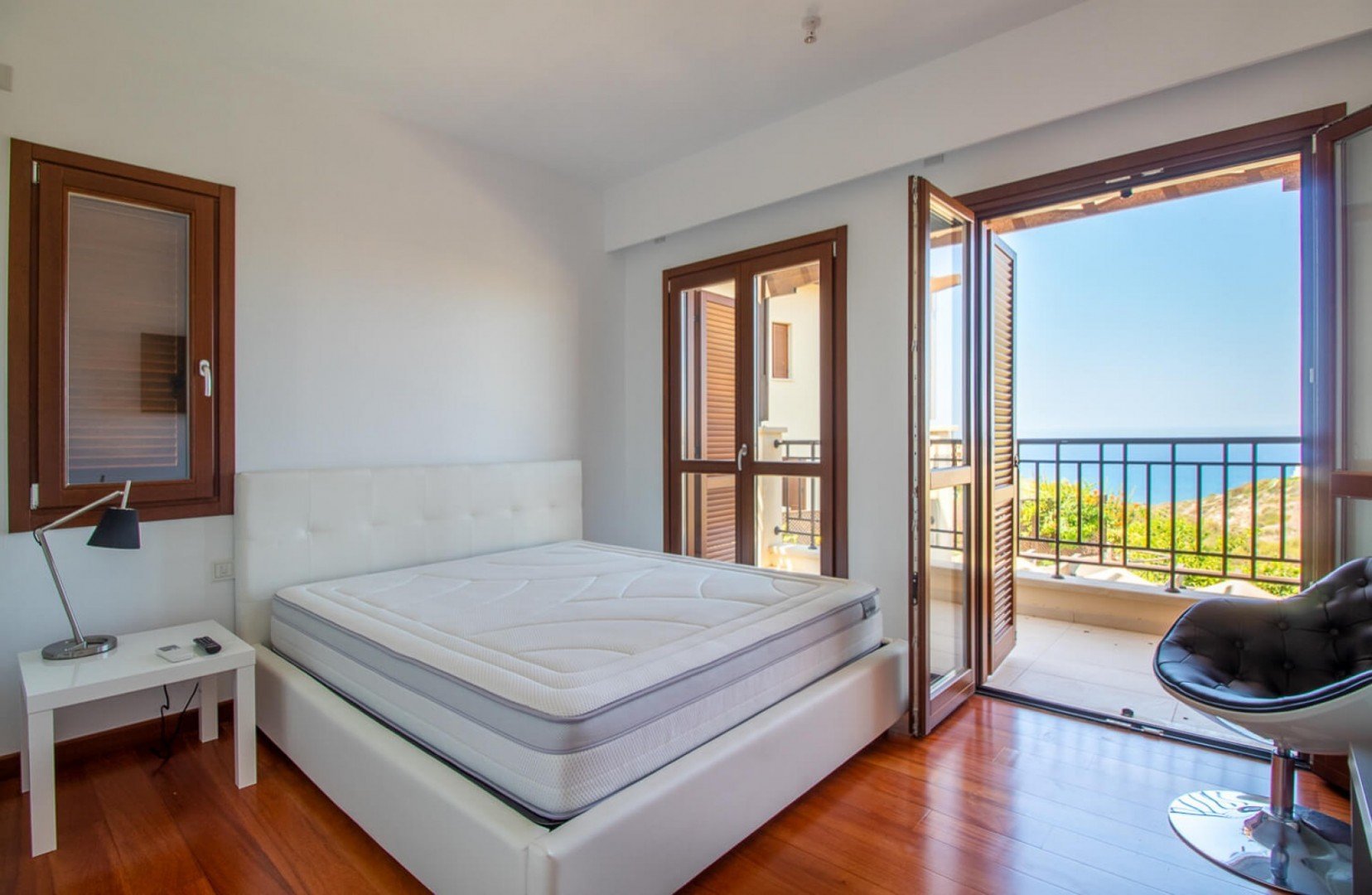 The marble staircase leads up to the first floor, with three more bedrooms and even more wide-sweeping sea views. The master bedroom is exquisite, with beautiful furnishings giving a true sense of luxury. Featuring a sumptuous king-size bed and shuttered French doors opening out to the balcony from where one can take in the panoramic views, and an en-suite bathroom which is fully tiled in granite offers twin washbasins, WC, bath and separate shower.