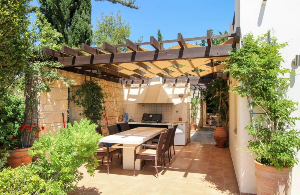 Outside, the villa continues to impress. Stepping out through the elegant French doors, you are greeted by landscaped gardens inspired by traditional Cypriot design, mature trees, aromatic shrubs, and a sense of Mediterranean serenity. The expansive outdoor terrace, complete with a large private swimming pool and a dedicated BBQ area, offers an exceptional setting for entertaining and hosting gatherings in true resort-style comfort.