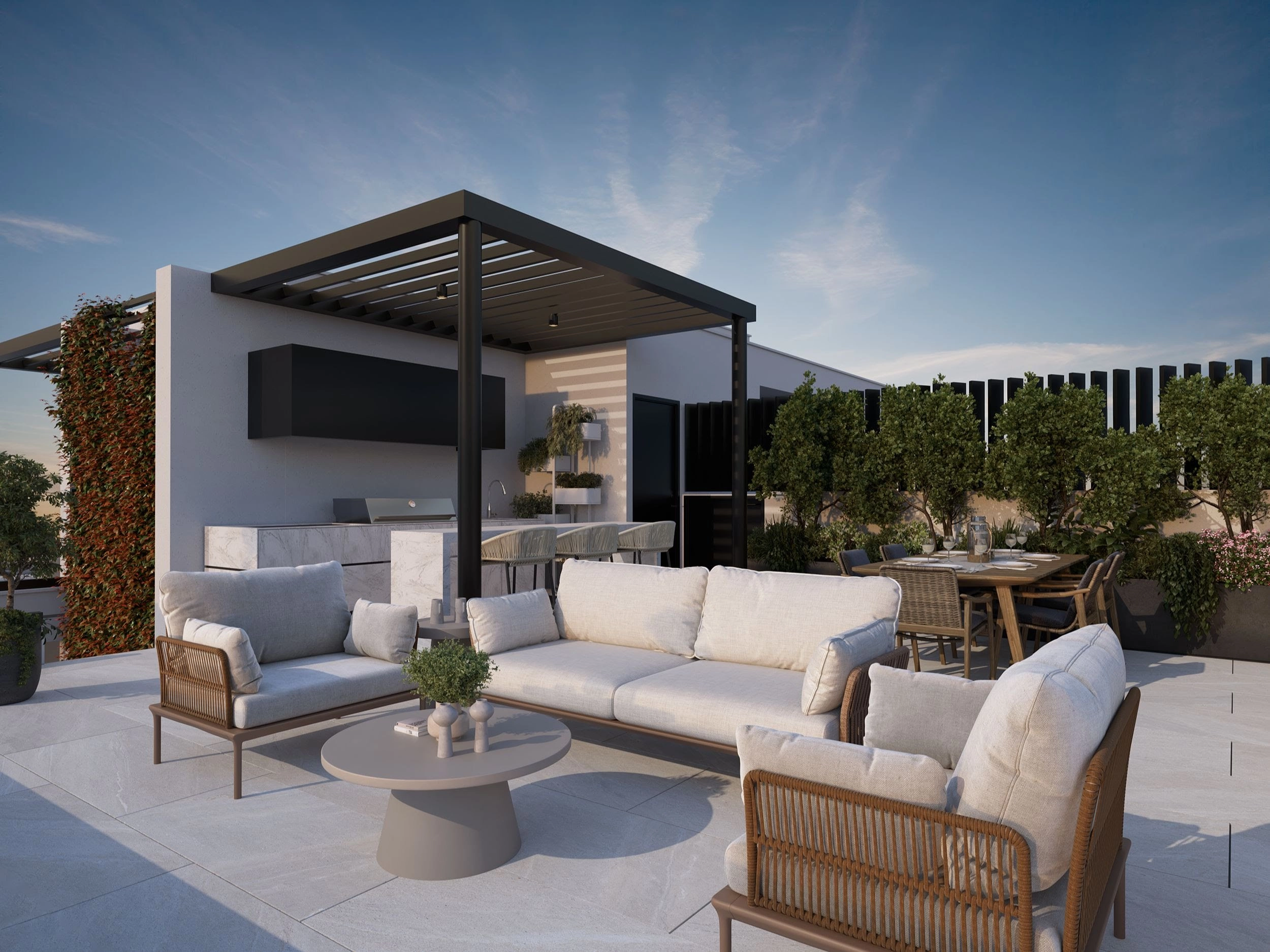 This spacious 3-bedroom apartment represents the premium offering of the development, combining generous interior areas with exclusive outdoor features. Positioned on the top floor of Block A, it provides maximum privacy, panoramic views, and direct access to its own private roof garden.
