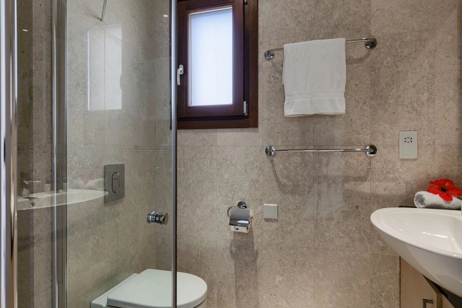 Crema marble flooring is used in the living, dining, kitchen, and bathroom areas, while the bedrooms feature parquet flooring.