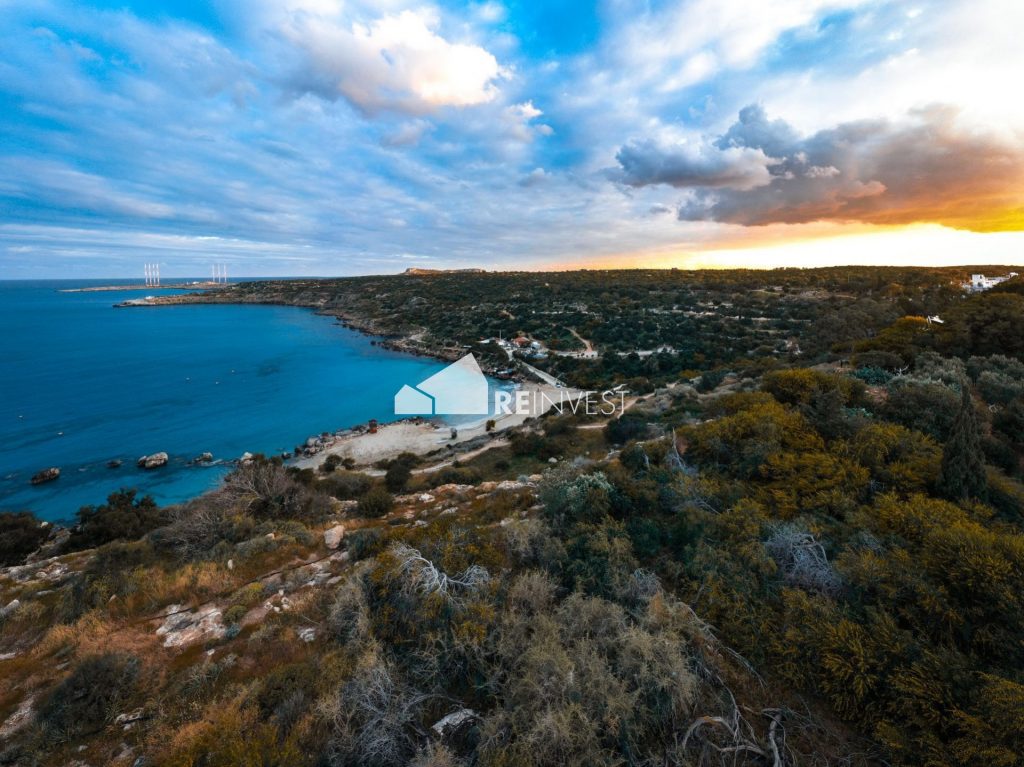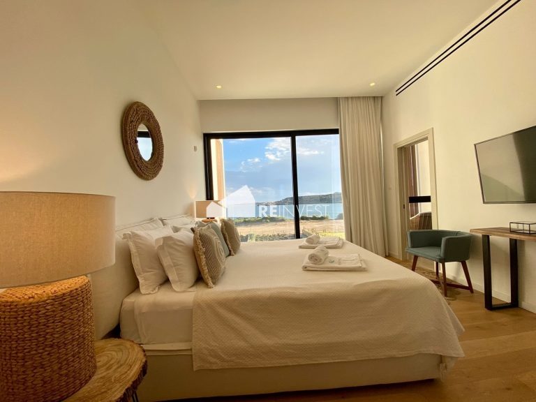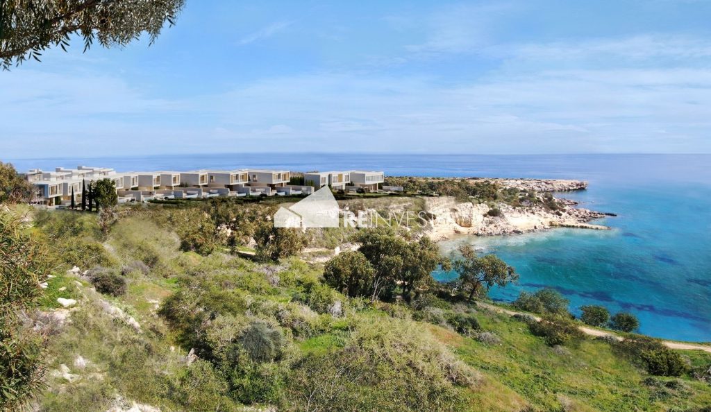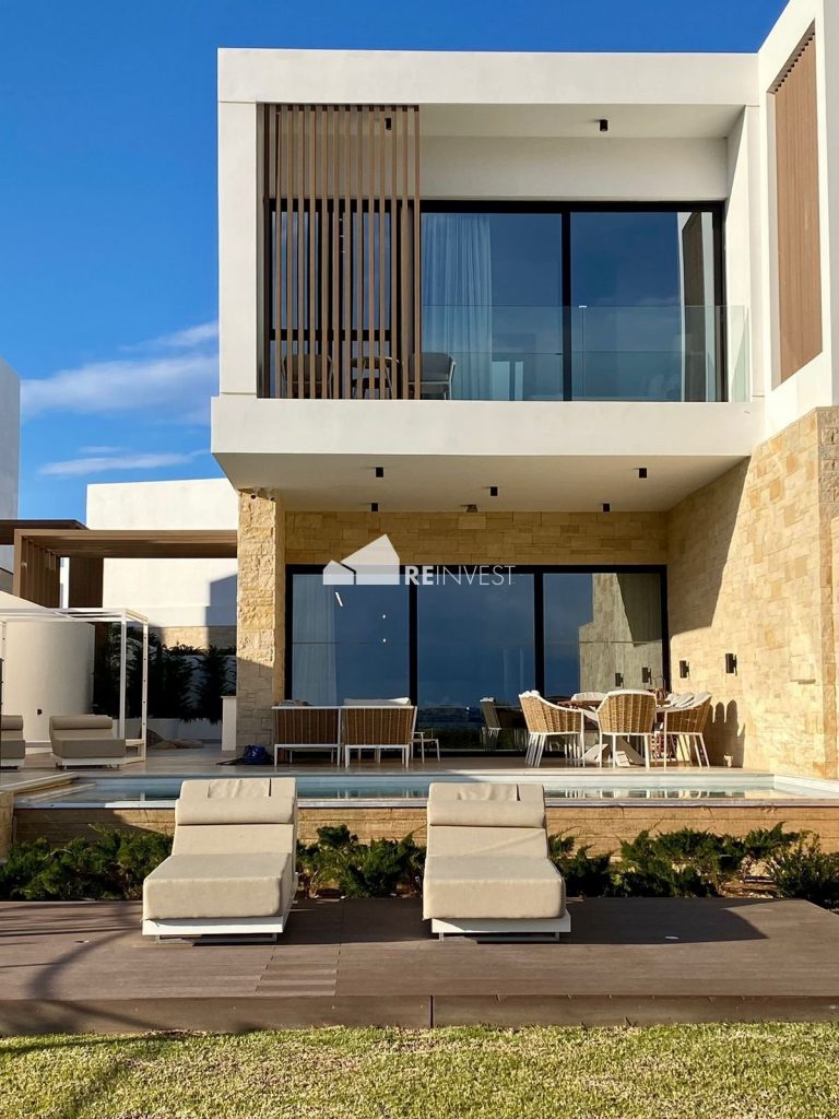 Luxurious four-bedroom, seafront villa for sale in Protaras, Famagusta. Located in a prominent seafront surrounded by the dramatic nature of Konnos areaand Cape Greco national park between Ayia Napa and Protaras in Cyprus. The region is one of the most beautiful parts of Cyprus. The contemporary, two-storey villa consists of four bedrooms with ensuite facilities (one bedroom on the lower ground floor), guest W/C, large open plan kitchen/dining/living room area, laundry area, private pool, outdoor lounge area for sunbathing, and two covered parking spaces.